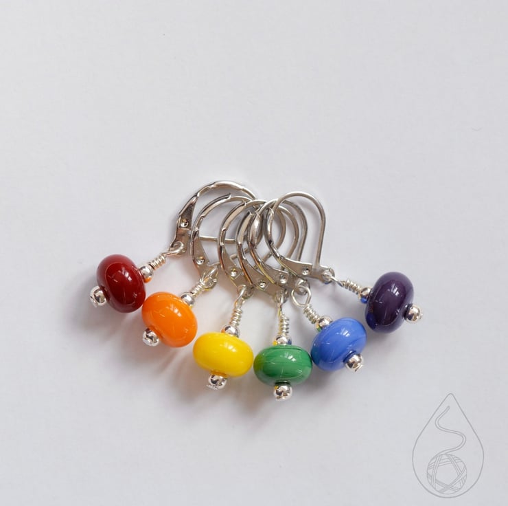 A set of 6 stitch markers made with lampwork glass beads in the red, orange, yellow, green, blue and purple of the Rainbow Pride Flag.