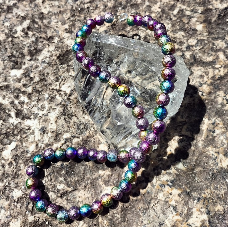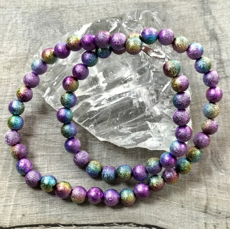 This necklace is 18" in length with a silver plated bolt ring clasp.