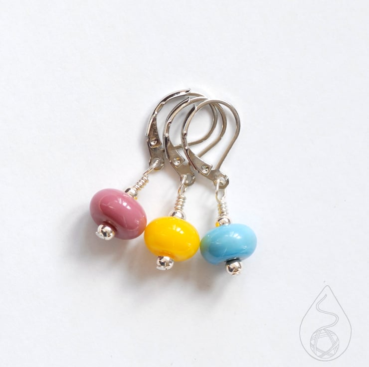 A set of 3 stitch markers made with lampwork glass beads in the blue, yellow and pink of the Pansexual / Pan Pride Flag.