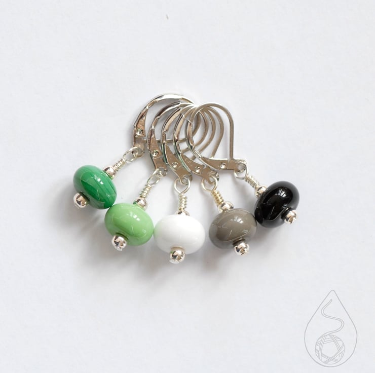 A set of 5 stitch markers made with lampwork glass beads in the greens, white, grey and black of the Aromantic Pride Flag.