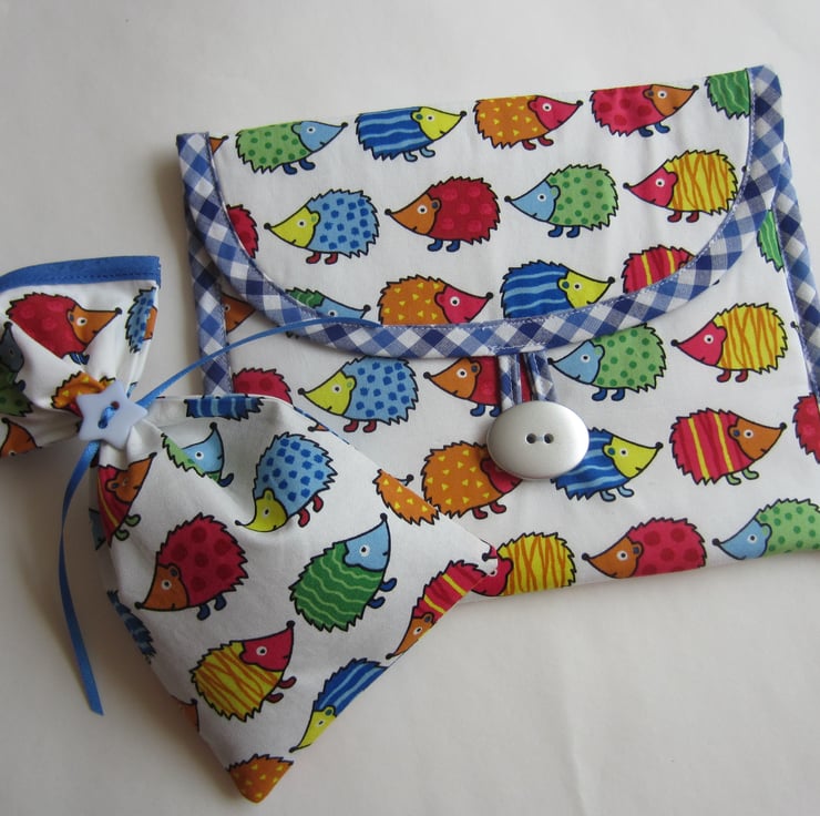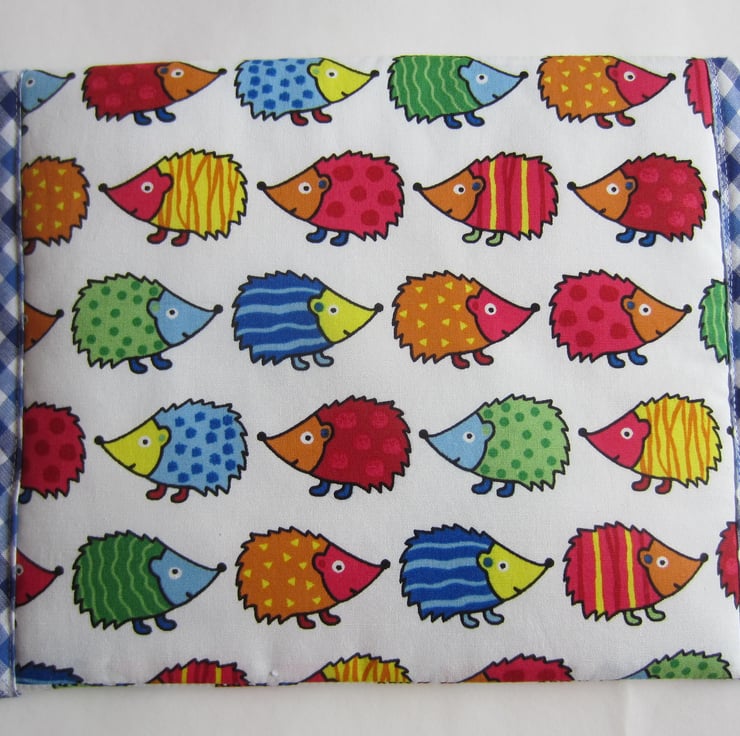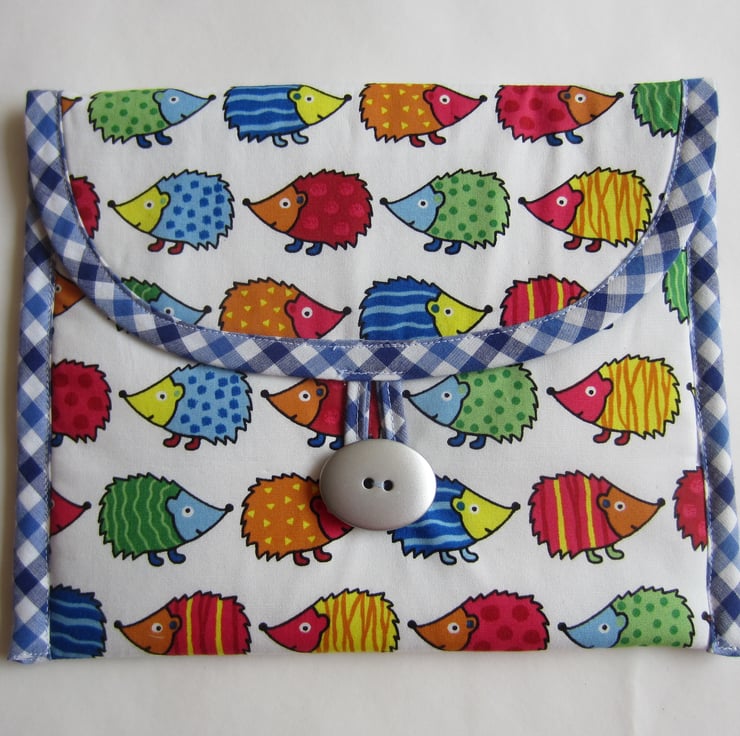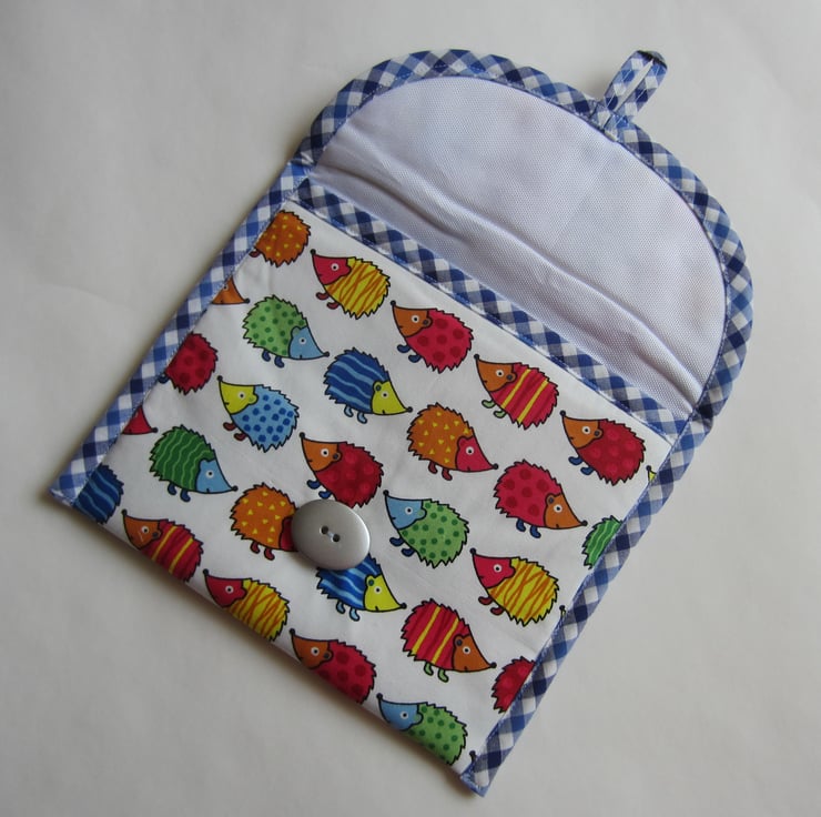 Lightly padded make up bag made with a fabric featuring brightly coloured hedgehogs on a white background. It is edged with a blue and white gingham check bias binding and lined with a white waterproof fabric.