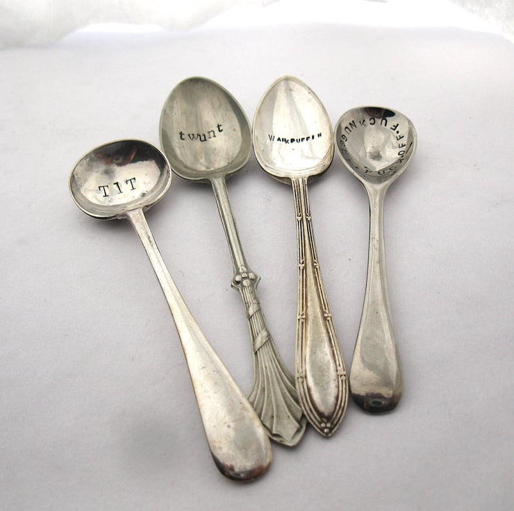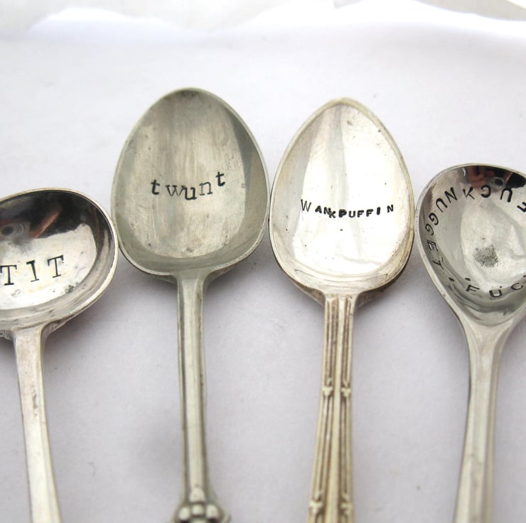 Four rude little spoons hand stamped with 't-t', 'tw-nt', 'w-nkpuffin' and 'f--k off f--knugget' so you can be rude and insulting with style. These are perfect for sneaking into a despised relative's cutlery drawer, giftwrapping for a secret santa exchange, leaving on a loathed colleague's desk or stirring an unwanted guest's coffee. Also brilliant for stag party favours. The choice is yours...