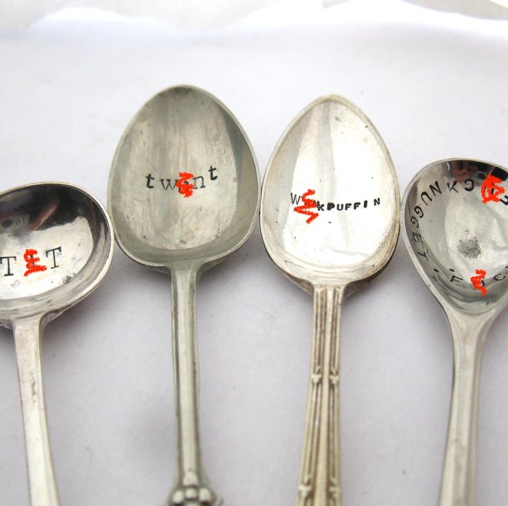 The spoons are between 8 and 12cm long, all vintage (or maybe antique), with hand stamped lettering coloured black with a non-toxic, waterbased ink. They are old, battered, mismatched and hence for sale as a bargain bundle. I hope they'll make you smile!