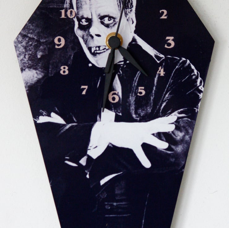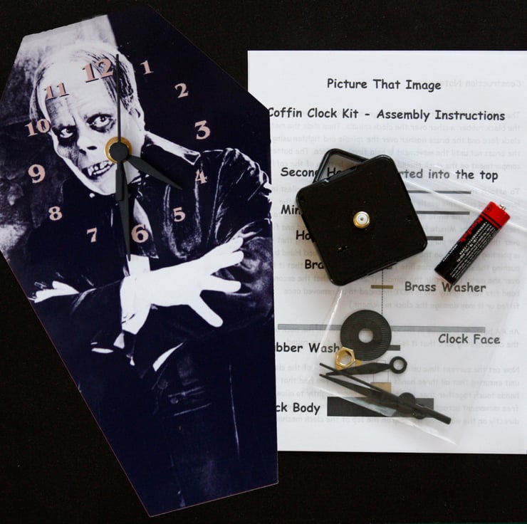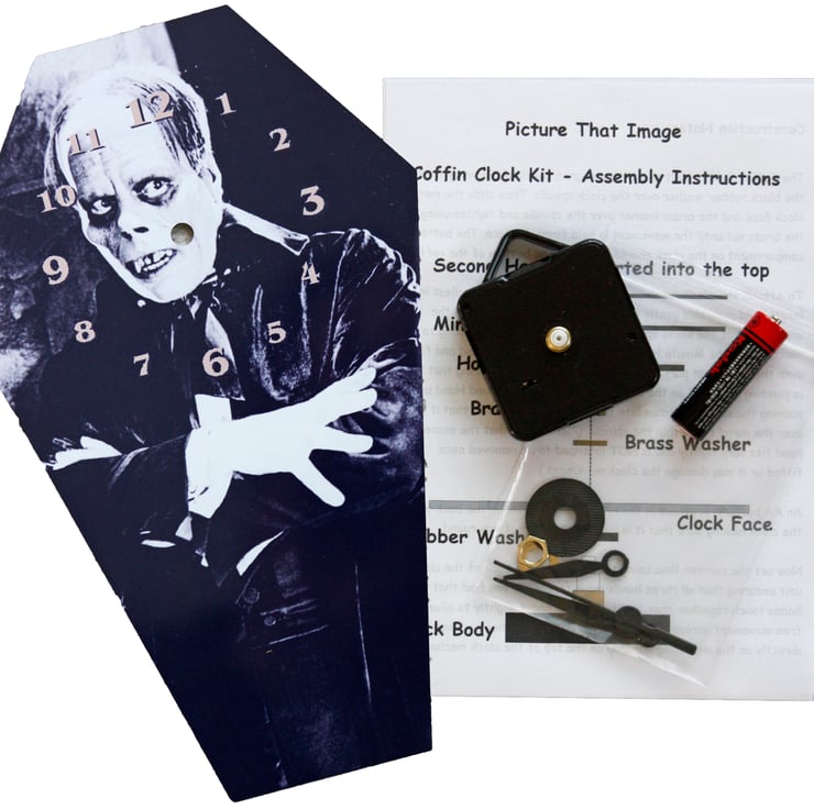 Everything that you need to build this unique coffin shaped wall clock is included in the pack. The clock is printed on a 25.5cm by 16cm aluminium coffin shape. The kit comes with a full set of instructions with an easy to follow diagram. (It does contain small parts so is not for very young children)