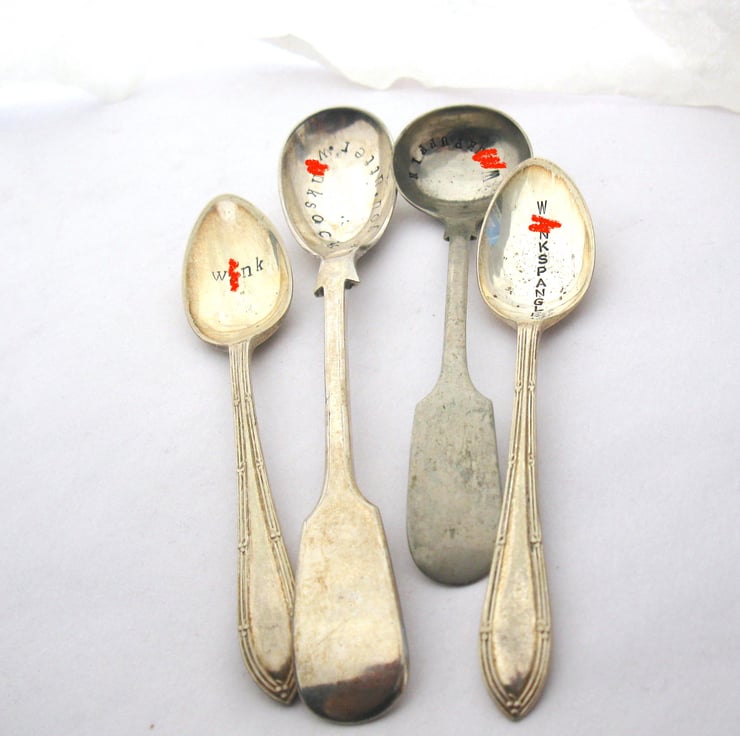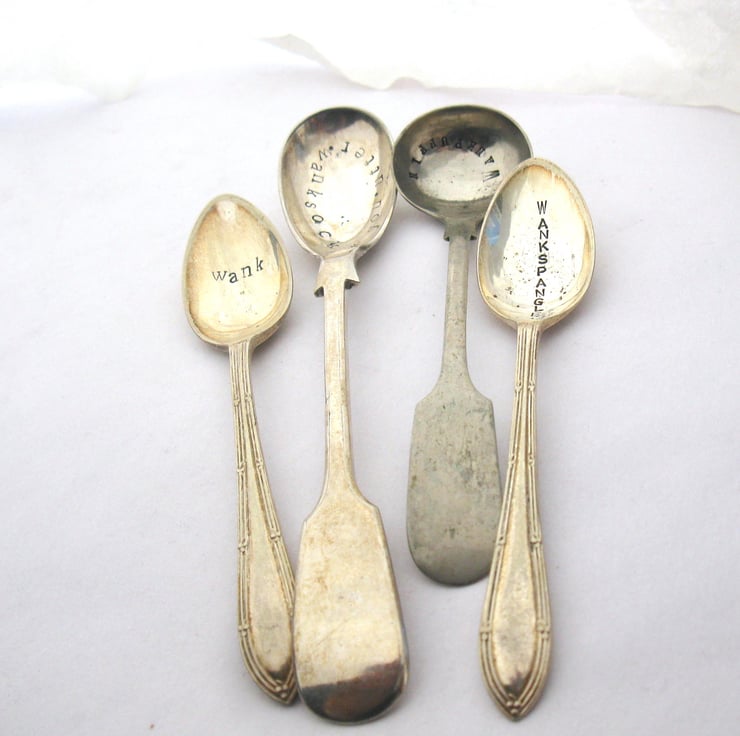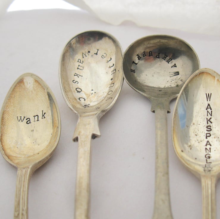 Mismatched set of four small vintage spoons handstamped with various takes on the word 'w-nk'. Definitely for adults only. And then only if they have a rude sense of humour. In which case there are many occasions for which these spoons would be perfect. Give one to a w-nker you know, whether it's as an expression of jocular affection or a true reflection of your feelings; scatter them round the table at a stag do; slip one into a despised colleague's coffee; gift one to your local MP... I'm sure you can think of more.