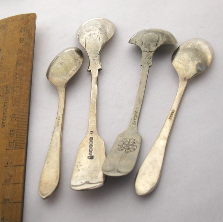 These are vintage spoons. You will get the four spoons shown in the photos. They are old, worn, tarnished and only two of them are matching, so they're for sale as a bargain bundle. The smallest is 10cm and the longest 13.5cm. The lettering is coloured black with a non-toxic acrylic ink.