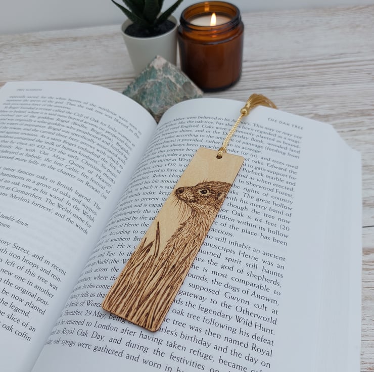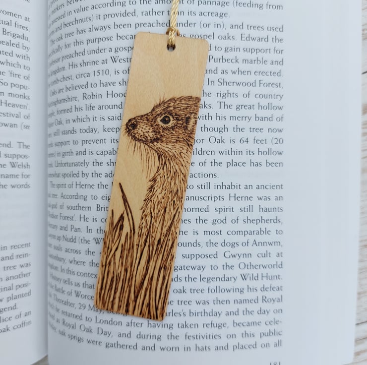 This bookmark features a quirky Otter. It's burned on ultra thin 1.5mm plywood and is approximately 3.2cm x 12cm. It's finished with satin varnish to protect from fingerprints and has a silky gold tassel.