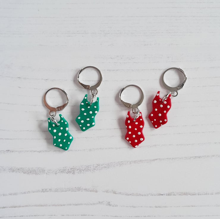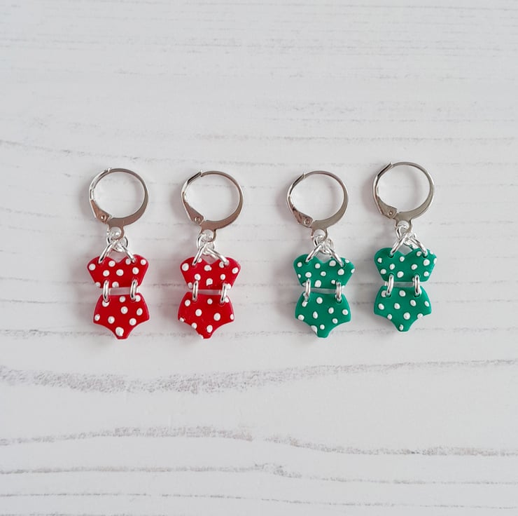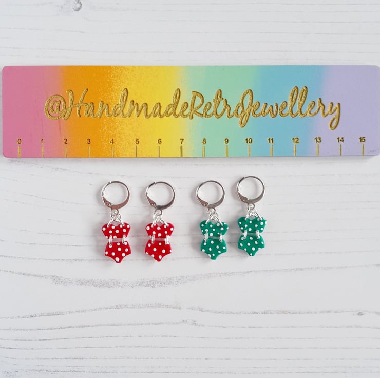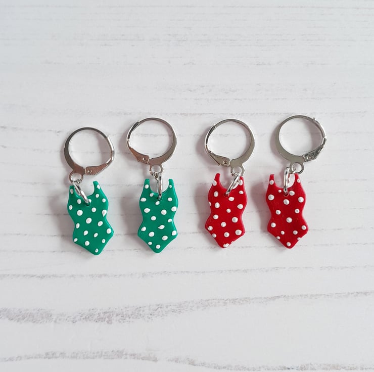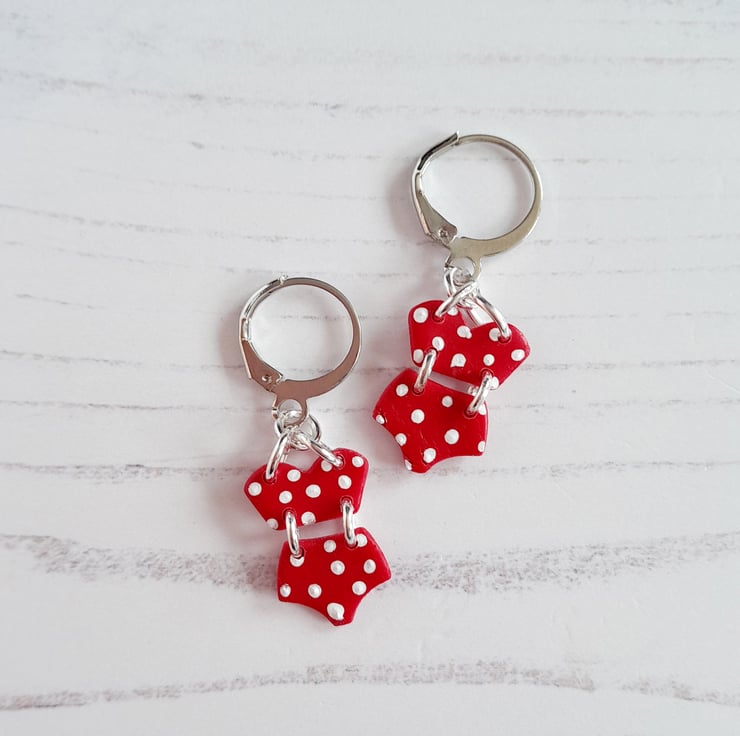 These oh so retro earrings have been carefully hand crafted using polymer clay in the shape of either a swimming costume, or a two piece bikini, with white polka dots added using acrylic paint then sealed with gloss. The earrings are then fixed onto silver plated mini 'huggie' hoops using jump hoops for a drop effect!