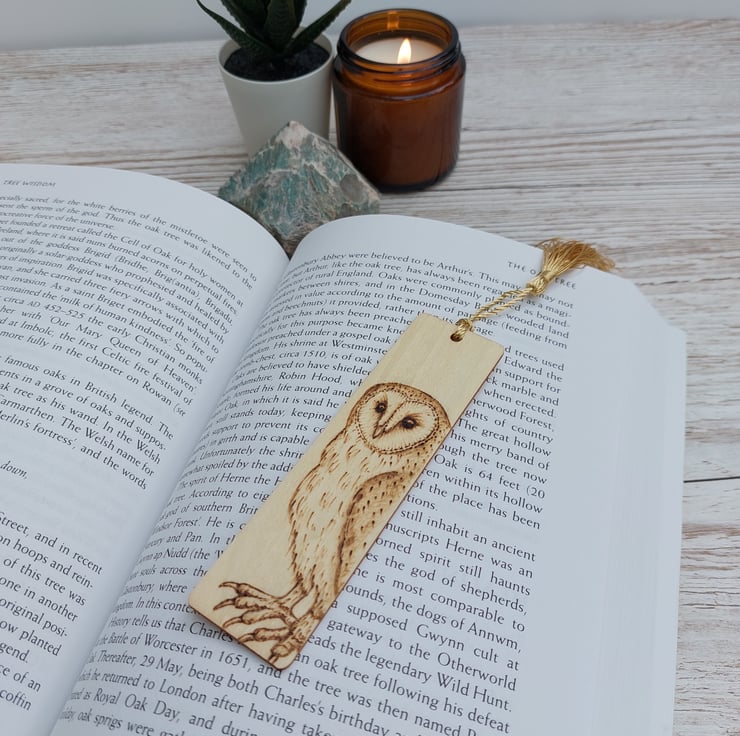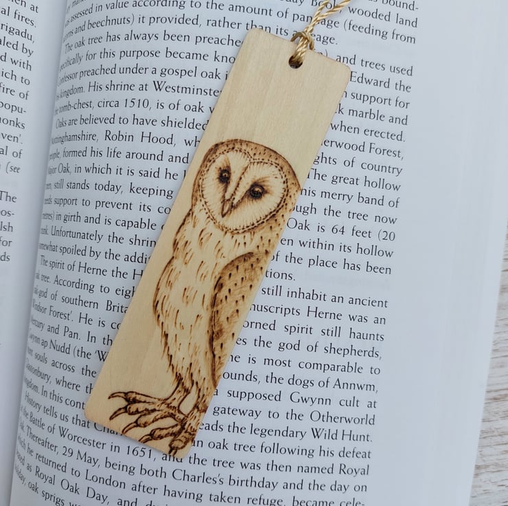 All my bookmarks are unique because I sketch directly onto the wood and then hand burn the design. This one features a barn owl, I see them often in the evenings in summer.