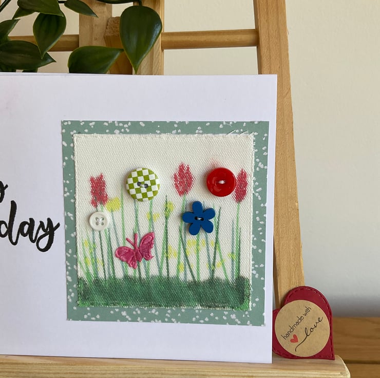 This hand crafted greetings card features a shades of red and green hand coloured fabric background adorned with colour coordinated buttons and fabric butterflies.