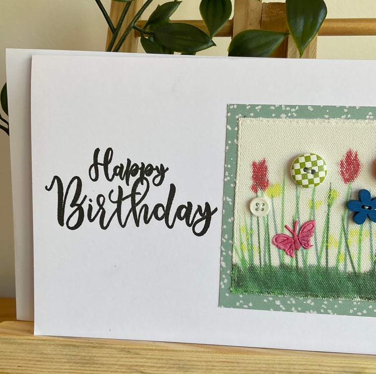 Inspired by the colours in my garden the subtle shades of green and red provide the perfect backdrop to the hand sewn button and butterfly detail. The card would make a lovely framed picture.