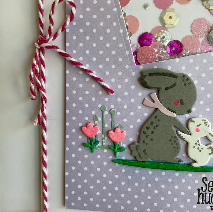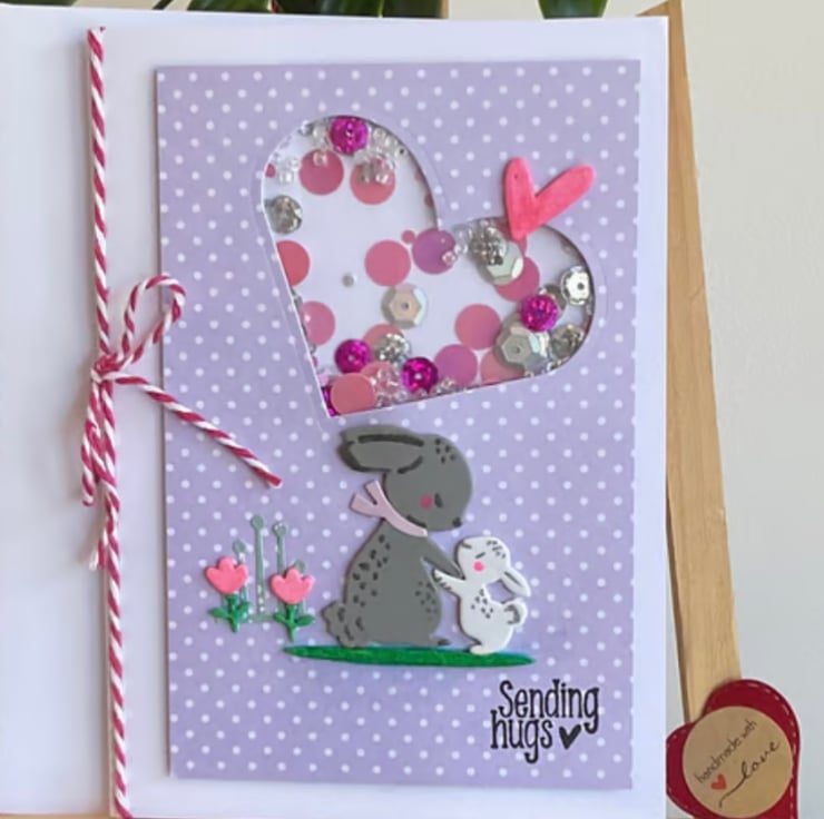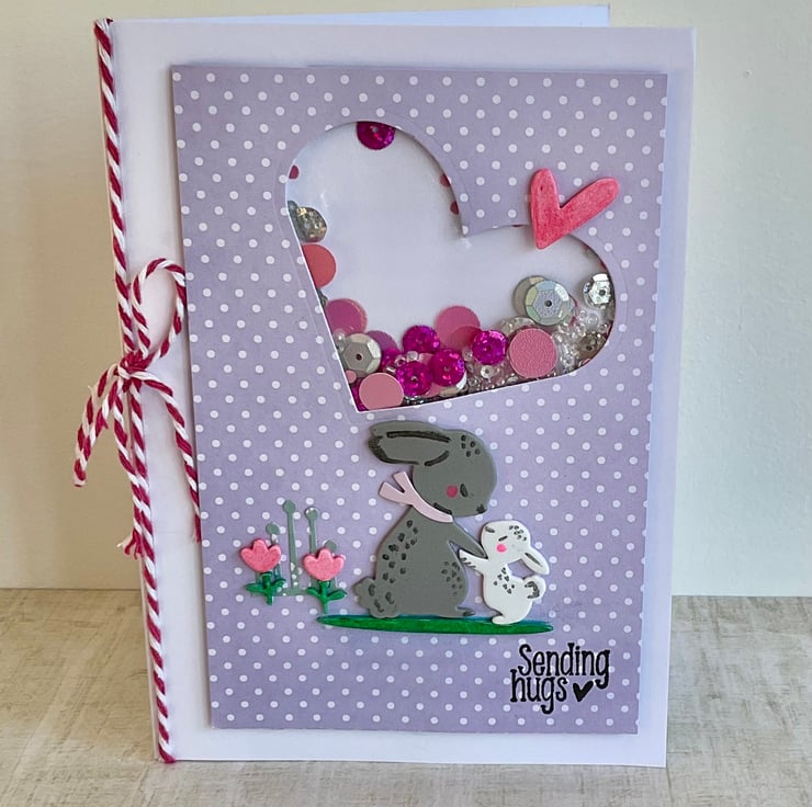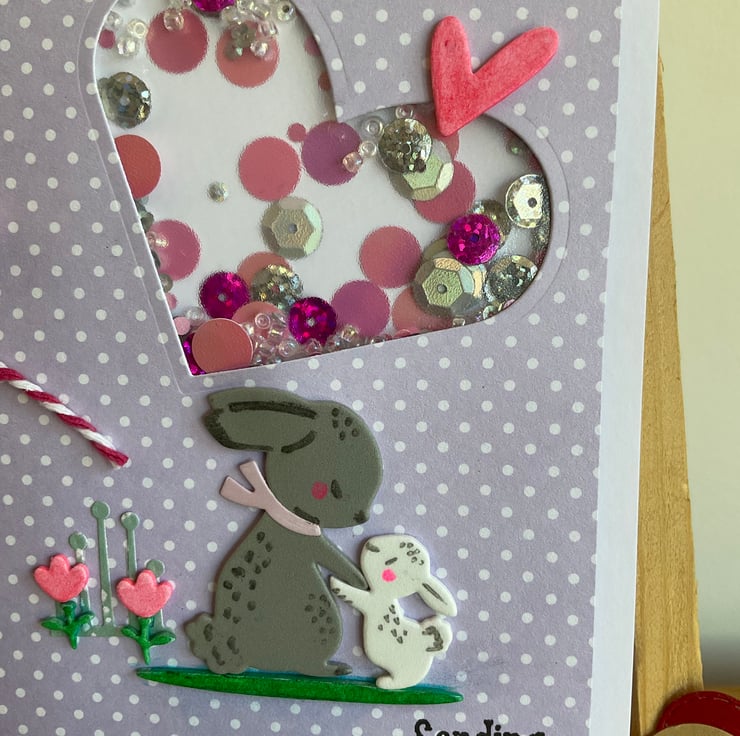 The card features two hugging bunnies, which have been die cut in 3d foam and hand coloured.