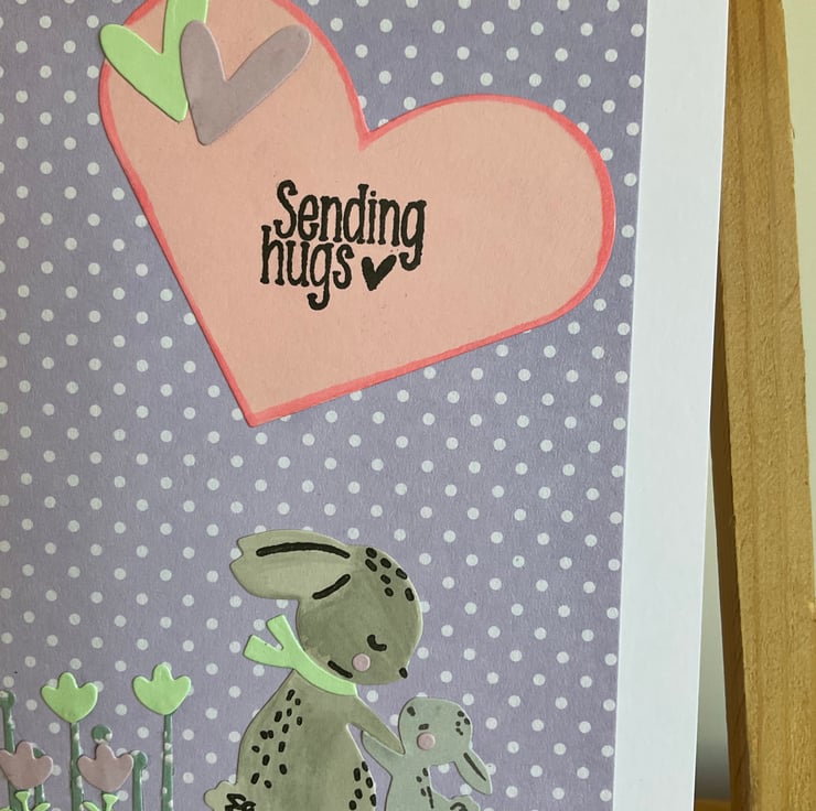A hand crafted greetings card featuring die cut bunnies, flowers and a pink heart with the wording ‘sending hugs’. The bunnies have been hand coloured using alcohol pens.