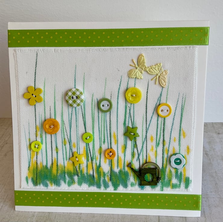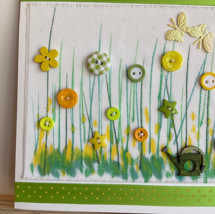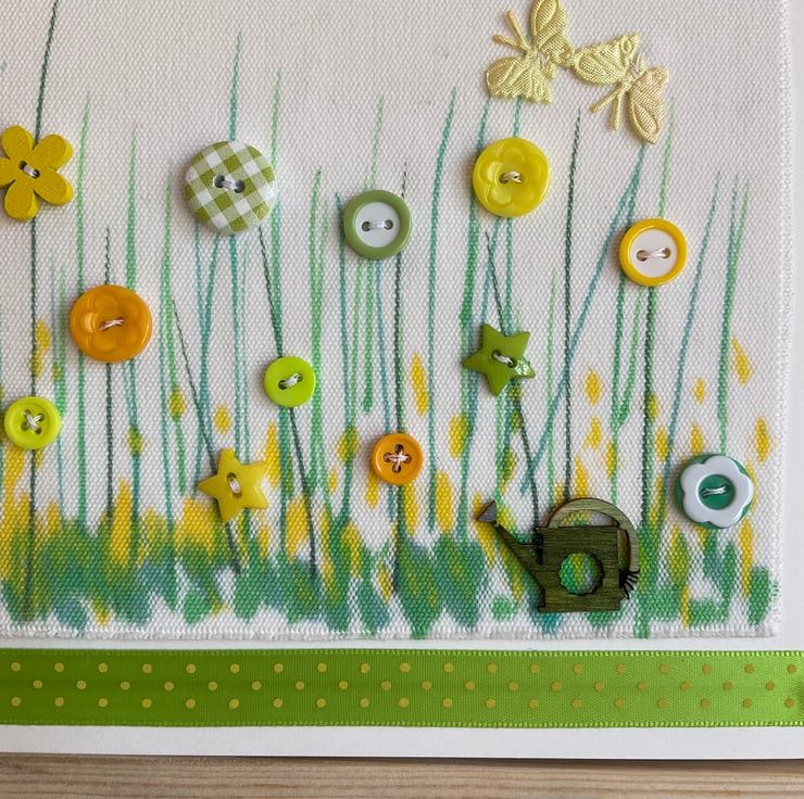 This hand crafted greetings card features a shades of yellow and green hand coloured fabric background adorned with colour coordinated buttons and fabric butterflies and a wooden watering can.