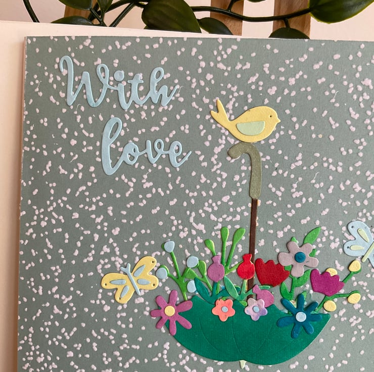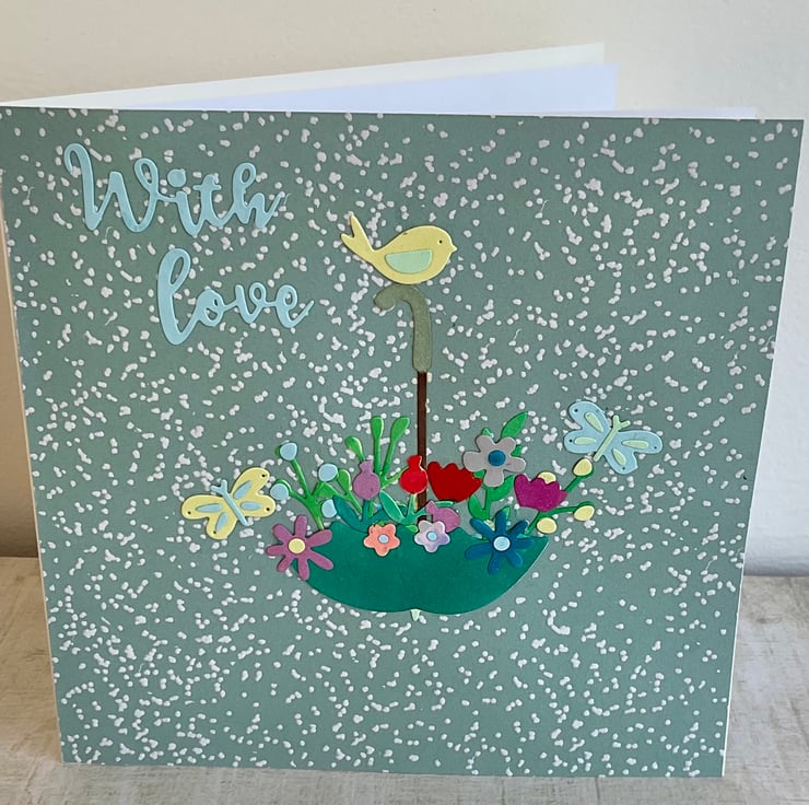 On a pale green spotty background this card is perfect for a birthday, to say thank you or for any special occasion. It features a green umbrella filled with die cut and hand decorated flowers and foliage along with a bird and butterflies.