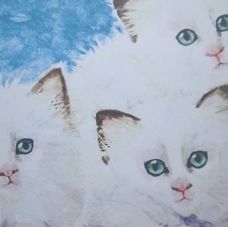 A print of my own original watercolour painting of three sweet white fluffy ragdoll kittens. Cat trio.