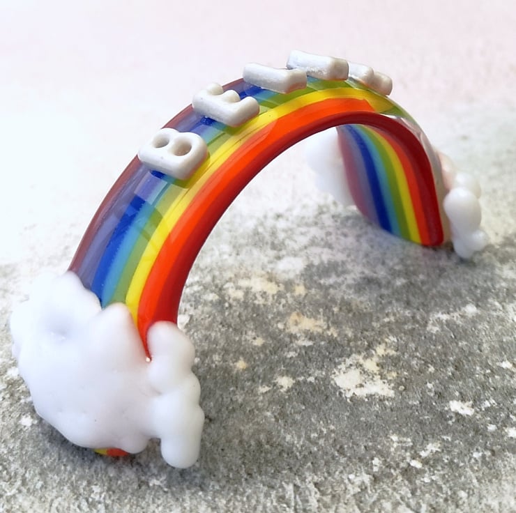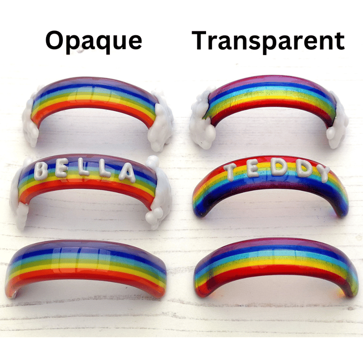 Please specify your chosen type. Can be ordered as a plain rainbow / with clouds / with name / or with clouds and name. Each type can also be ordered in either transparent or opaque rainbow coloured glass. (Sunlight will shine through transparent glass, reflecting the colours onto a surface. Opaque colours show up better when it's placed on a darker surface). The 3D letters are made from a glass clay which is permanently fused onto the glass base. Most names should fit, but if you have a long name to add please message me first to check it's possible, or I can refund the order if it's not.