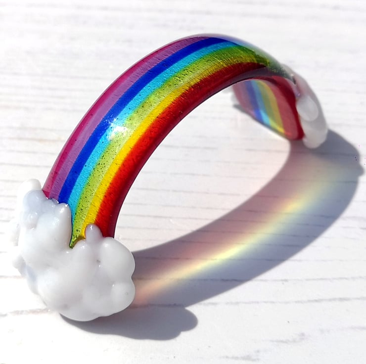 A free standing mini curved rainbow. Handmade from glass that has been fused in a kiln.