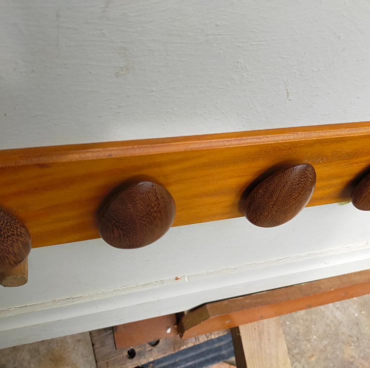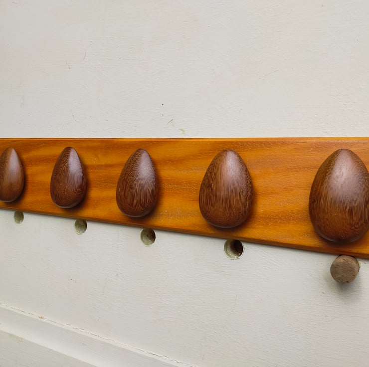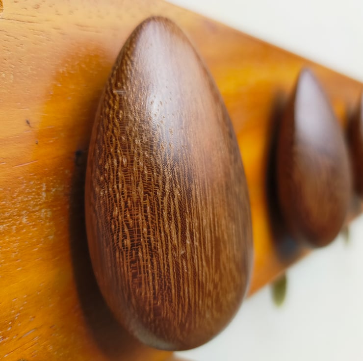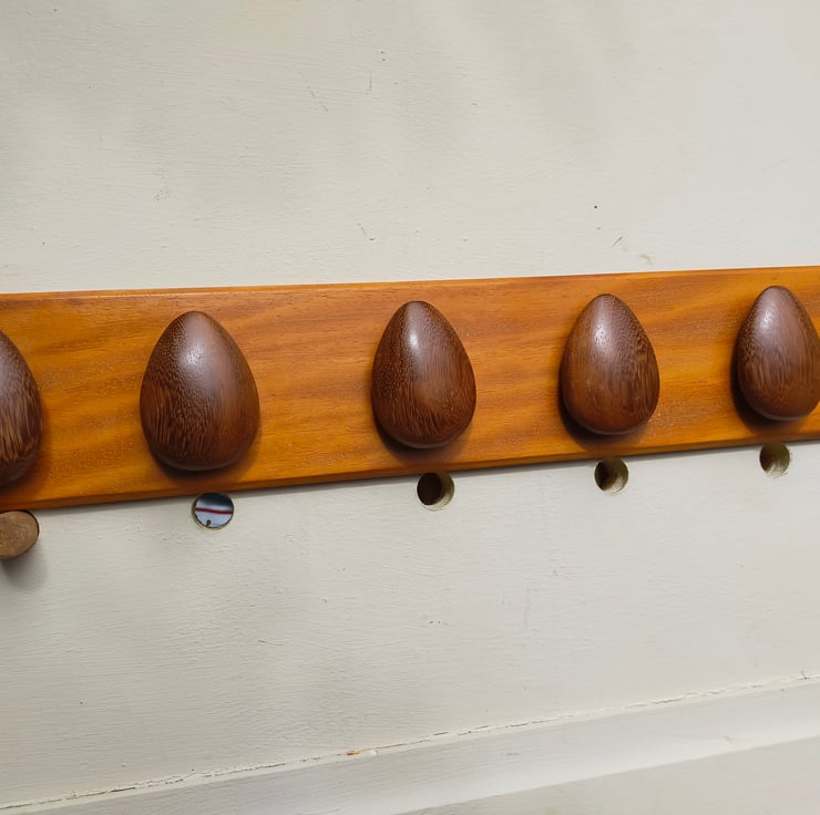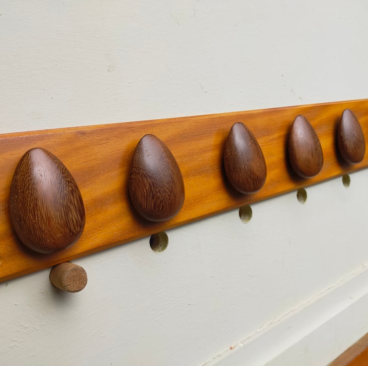 After using every inch of the reclaimed sapele window sill I got hold of, I had enough wood for six final pebbles. Not wanting to waste, of course, I made them slightly more bulbous and mounted them slightly closer together on one of the last pieces of mahogany I had. Personally, I think this more compact coat rack works really well, not least because of the contrast of the deep rich brown of the sapele with the more reddish brown streaks in the mahogany. At the risk of sounding pompous, I want my coat racks to look like works of art in your hallway so, granted, they won't hold a family's worth of coats, three satchels and a leather jacket. But each pebble will hold one coat absolutely beautifully! As with all my work, the pebbles are very firmly screwed and glued to the backboard. L610mm x H100mm x D40mm. Clear wax finish.