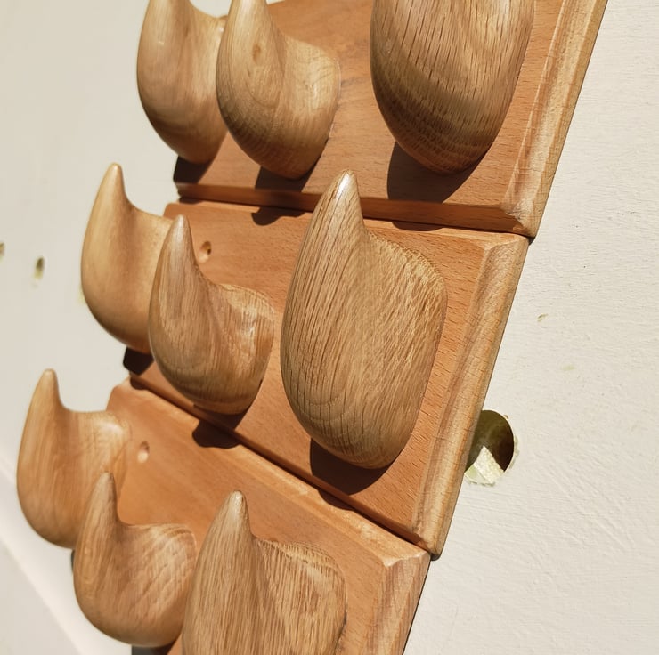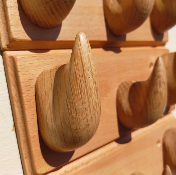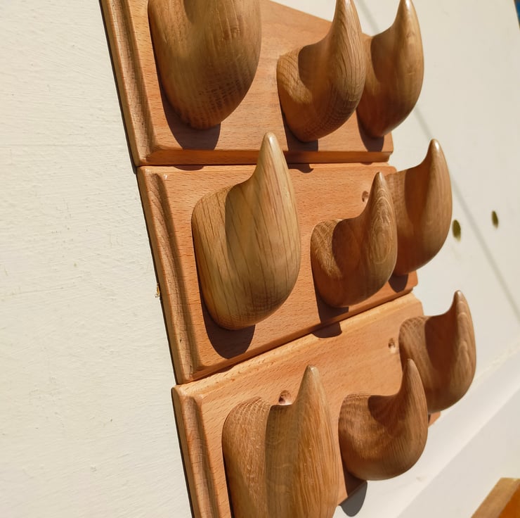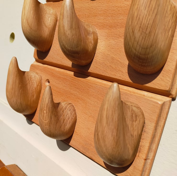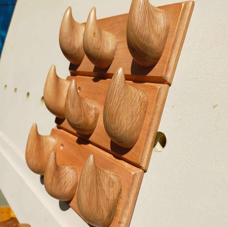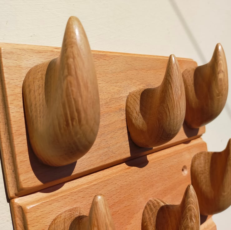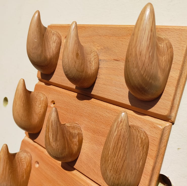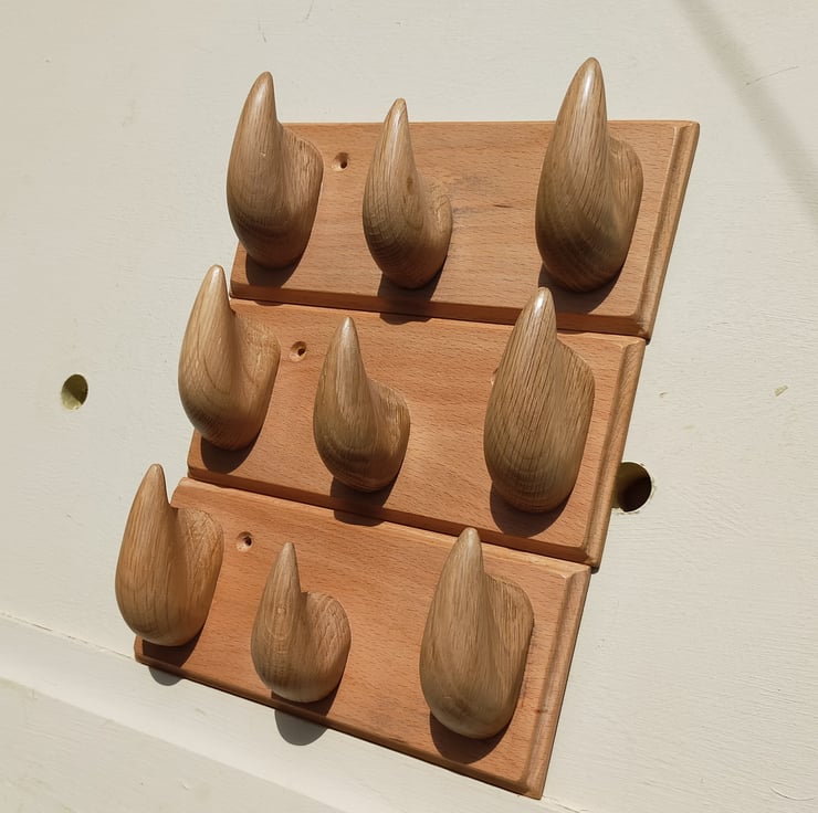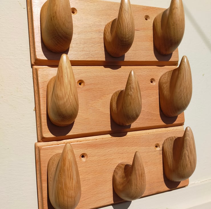 What do you do in a pandemic? You make stuff! These door claws, and many of the other items for sale, were the result of a period of feverish activity when the world was quiet and I could get on with what I love. I had collected all sorts of odds and ends of timber that were screaming out to have something done with them, so I took advantage of the terrible opportunity. Now, I humbly hope you can enjoy the fruits of my labours, in this set of three bed and bathroom hooks, far more individual and quirky the your run-of-the-mill metal, each one individually hand carved, sanded and polished, matching but far from Ikea-dentical.