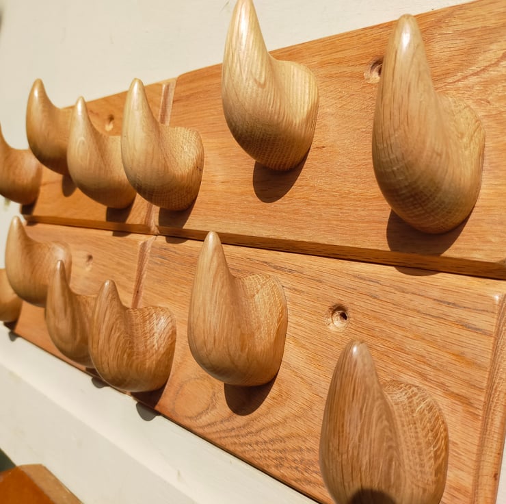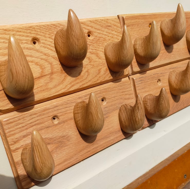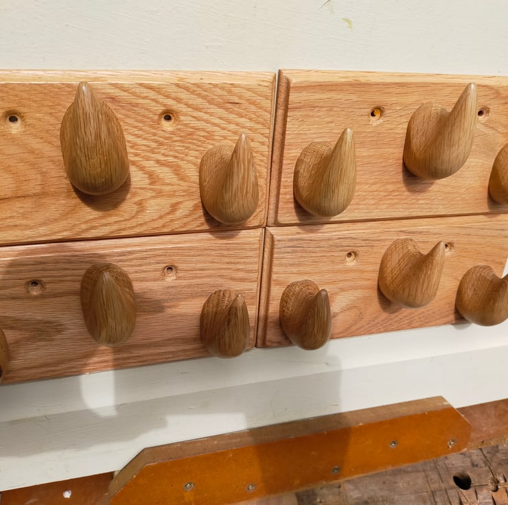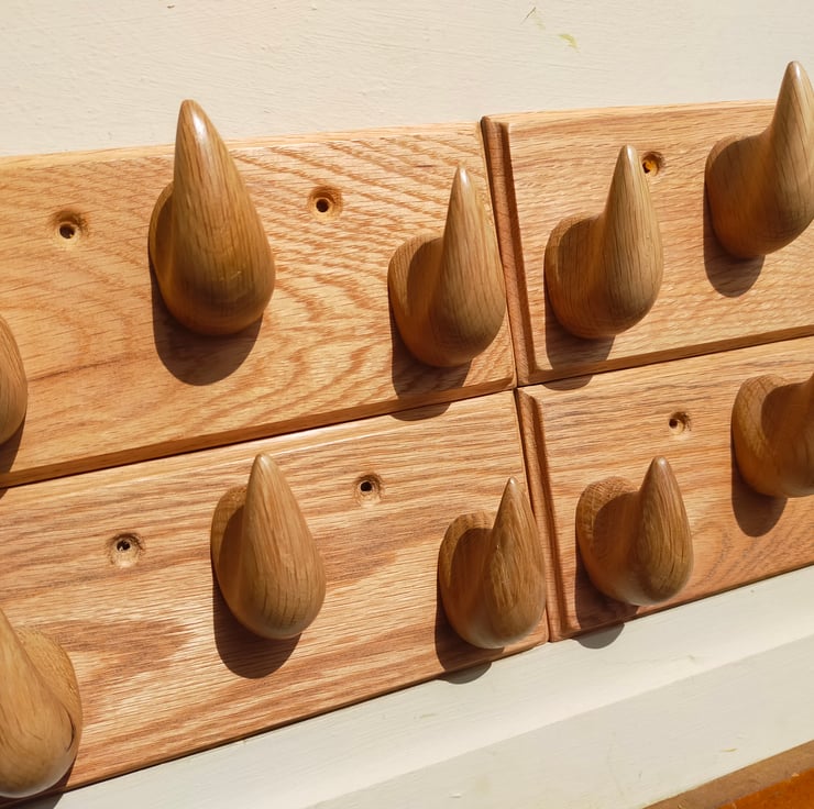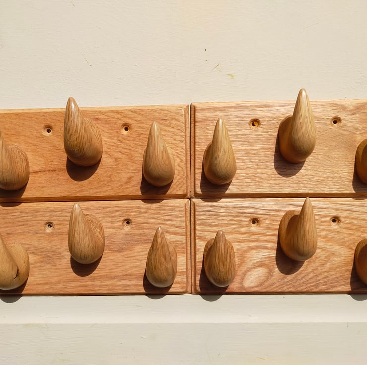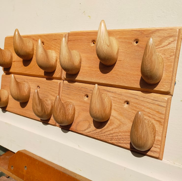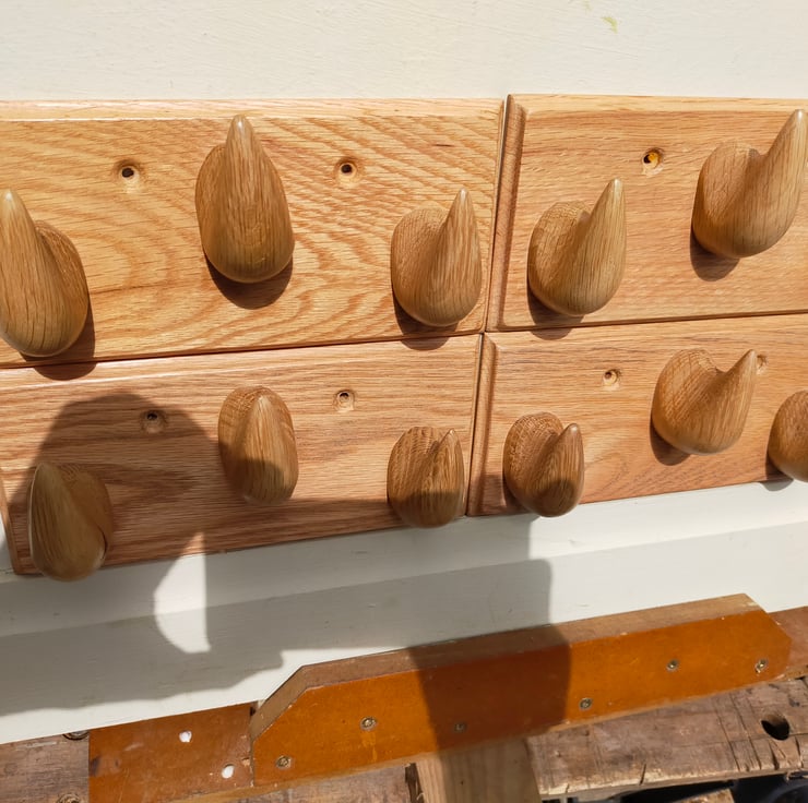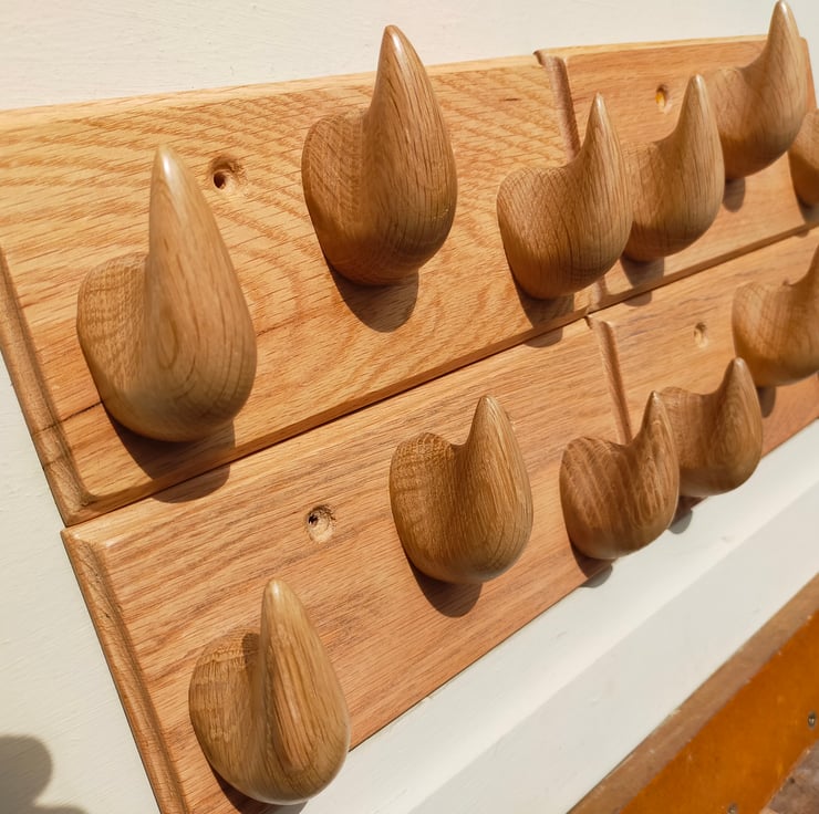 Claws or horns? Whatever, this set of four bed and bathroom hooks is tactile in the way that only polished wood can be. Three hooks per panel provide enough hanging space for dressing gowns and towels, and are the result of a period of feverish (sometimes literally) activity during the pandemic. Screwed and glued to their back panel, these individually carved hooks match but are far from being Ikea-dentical, because each one represents the single period of time I spent carving, sanding, polishing and waxing that specific hook.