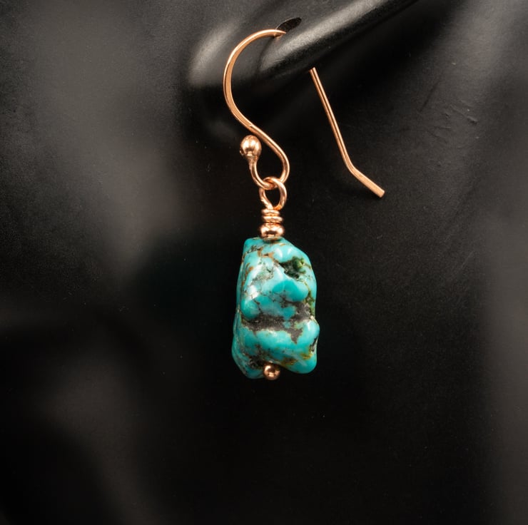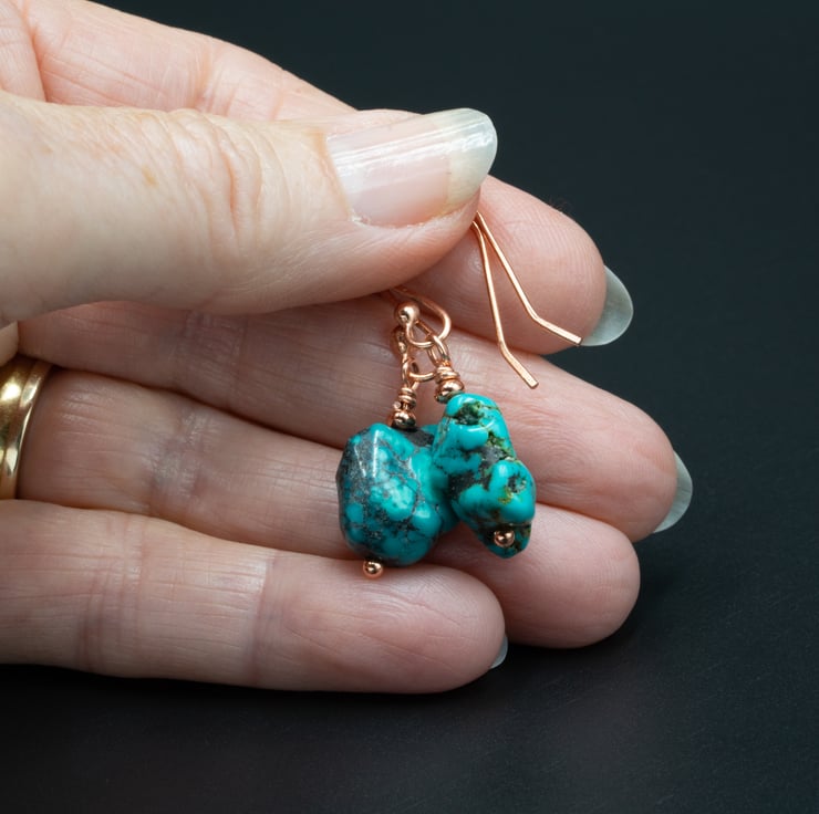 Nuggets of natural turquoise hang below a pair of handmade pure copper hook ear wires.