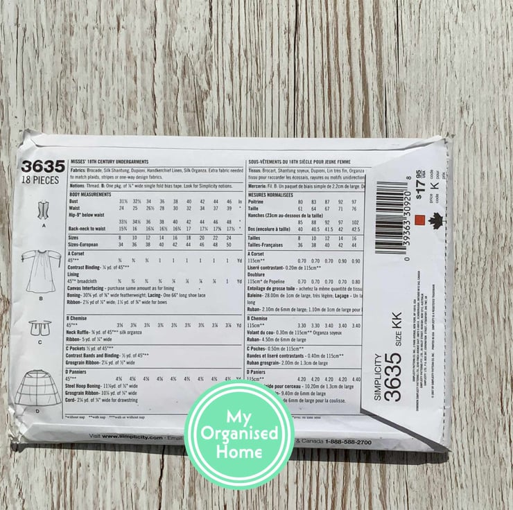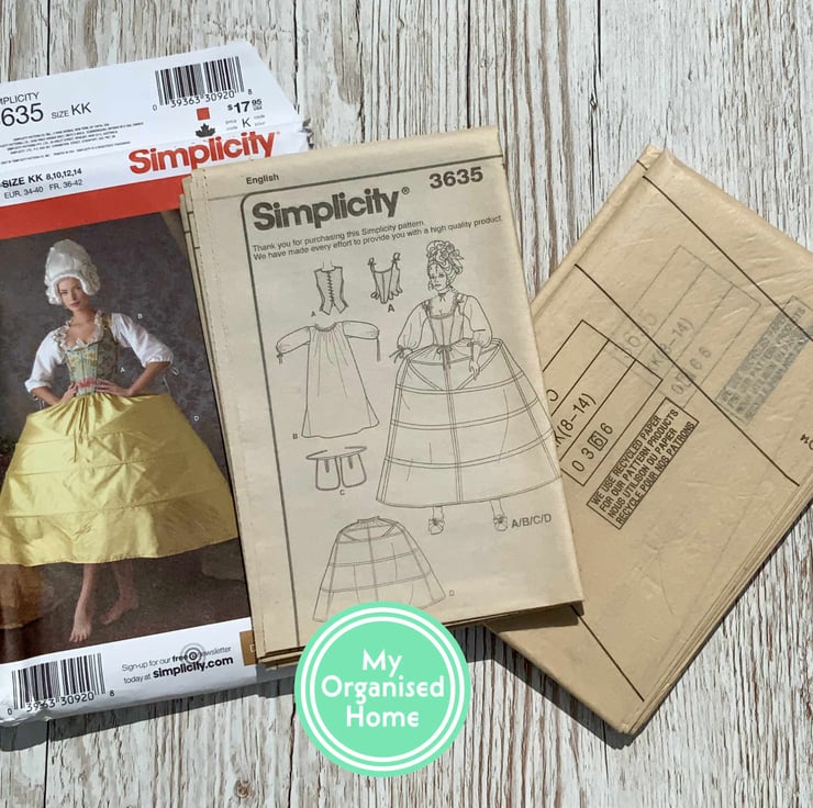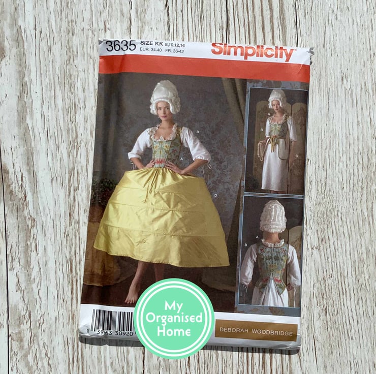 Simplicity 3635, Marie Antoinette style costume sewing pattern for misses corset, chemise, panniers and pockets, sizes 8-10-12-14.