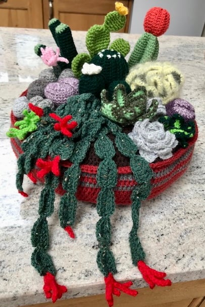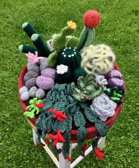 Ever forget to water your plants? Well this is your answer, crocheted plants. This beautiful set is completely crocheted including the basket style pot. A variety of yarns have been used to make the plants look extremely realistic. This will become a talking point in any home!