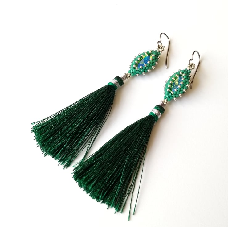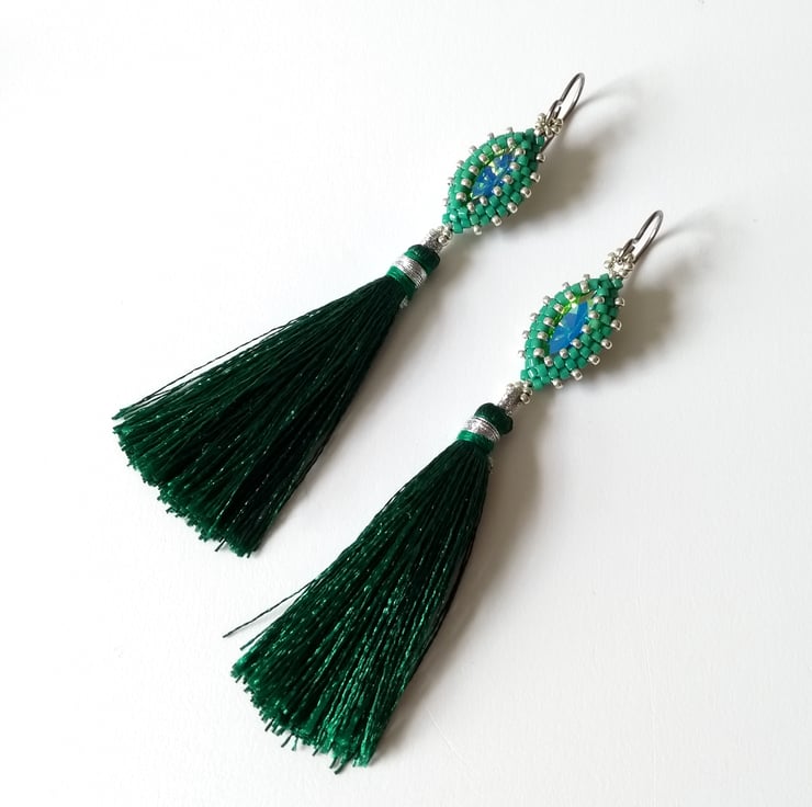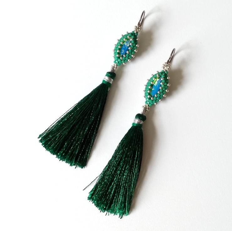 I have hand-beaded a 15 mm x 7 mm navette crystal - a elongated oval, sometimes called a marquise cut - and added a vibrant, swishy 5.5 cm tassel. This pair features a foiled back stone in lagoon, a lovely turquoise-green colour, together with glass seed beads in silver and emerald green. Also available in turquoise, see separate listing.