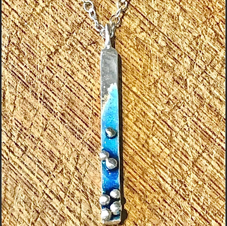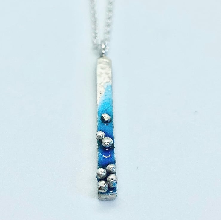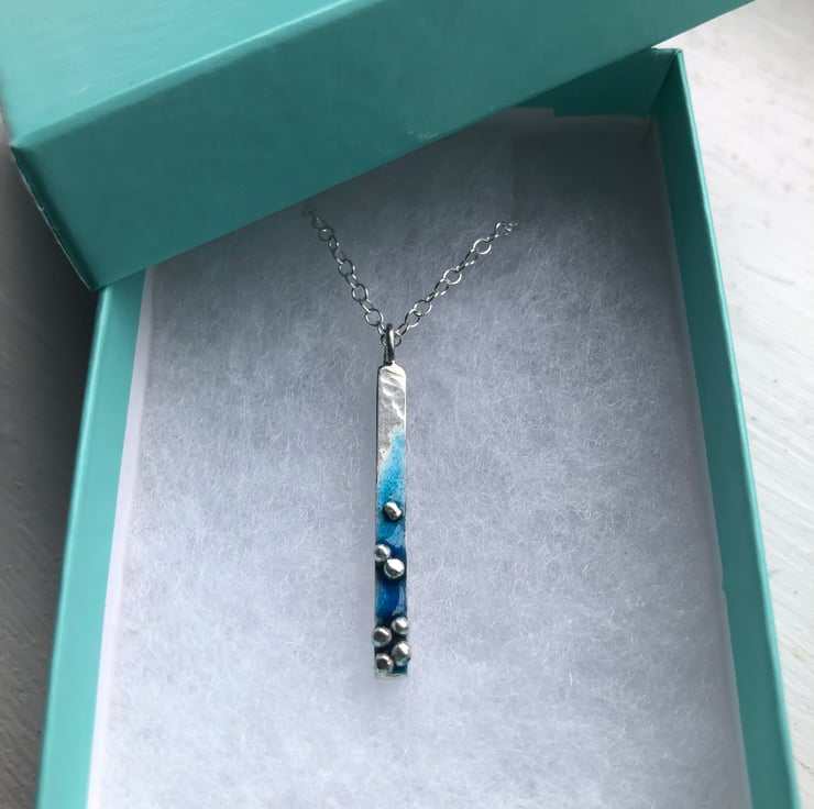 This enamel pendant is made from Sterling Silver and has beautiful blue enamels and Fine silver ‘bubbles’ detail. The pendant has been hammer textured and hangs vertically. It was inspired by the coastlines of the Mediterranean. The pendant measures approximately: 3cm in length and is a chunky 3mm wide square shape.