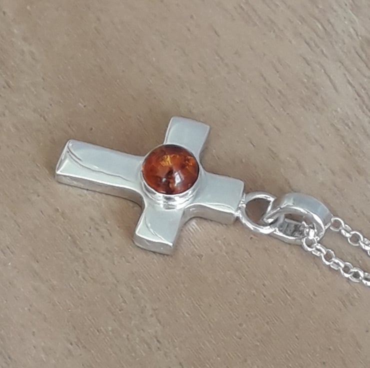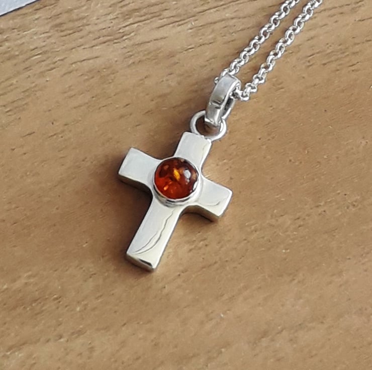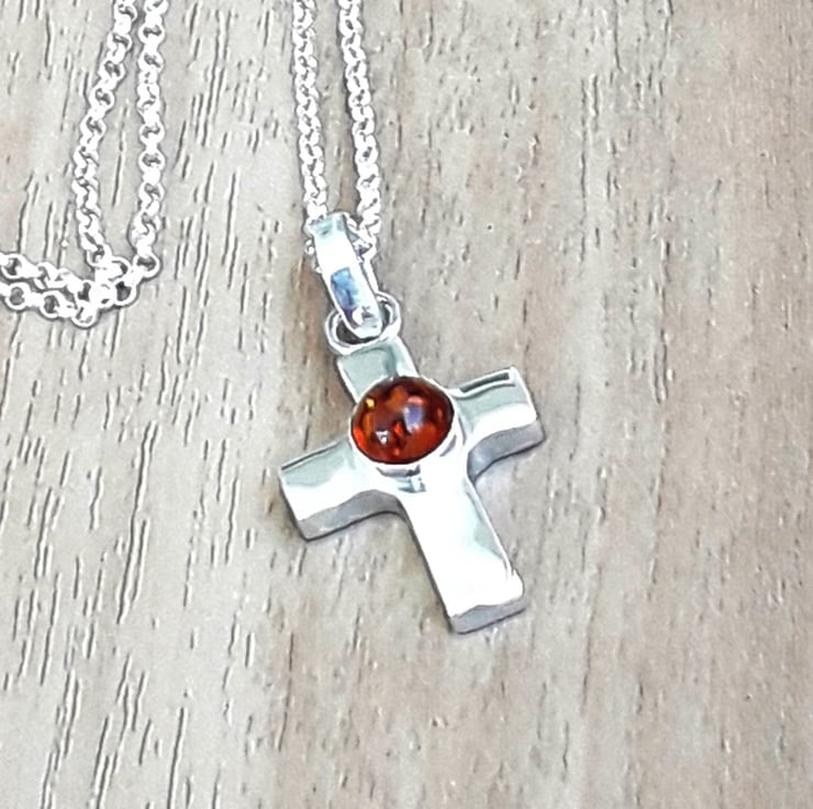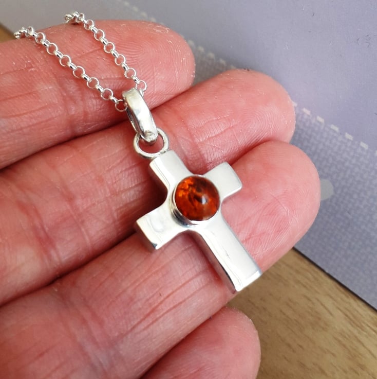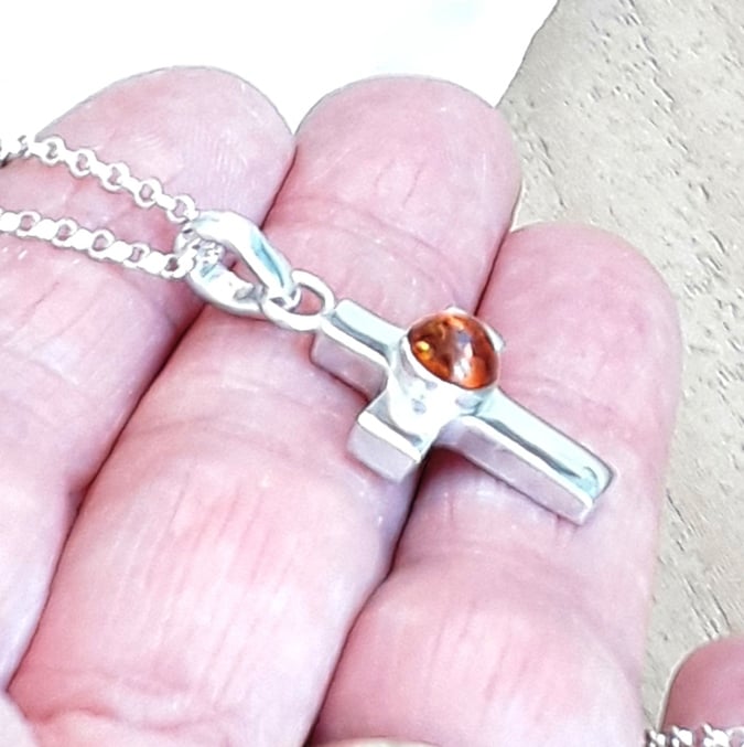 Handmade solid sterling silver Cross Necklace fearturing a 6 mm round Amber Gemstone.