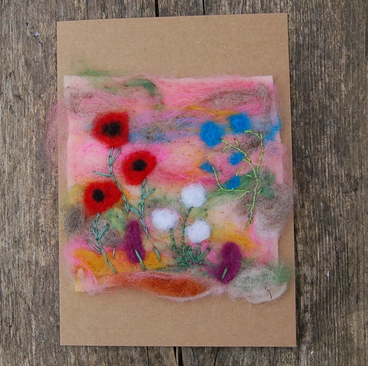 Wild flowers needle felted onto a piece of felt and lightly attached to a card.