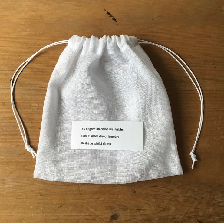 30 degree machine washable, line dry, reshape whilst damp.