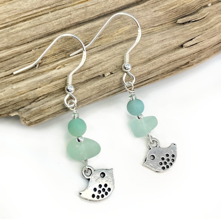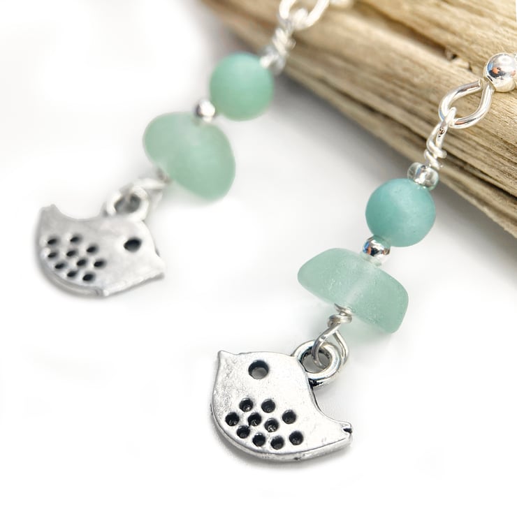 Cute sea glass drop earrings with tiny bird charms. The earrings are handmade with aqua green Scottish beach glass, frosted Amazonite crystals, sterling silver beads and a silver-plated bird charm. The earrings include nuggets of genuine sea glass, worn smooth and frosted in the Scottish sea. This pale green colour is evocatively known as 'sea foam'.