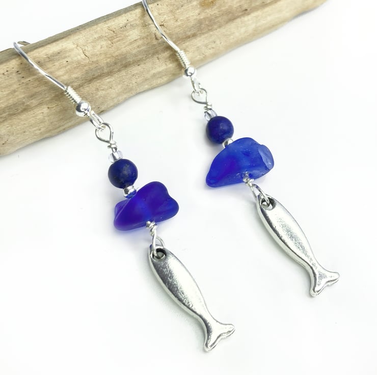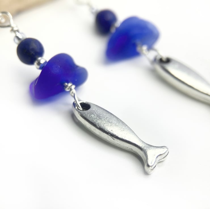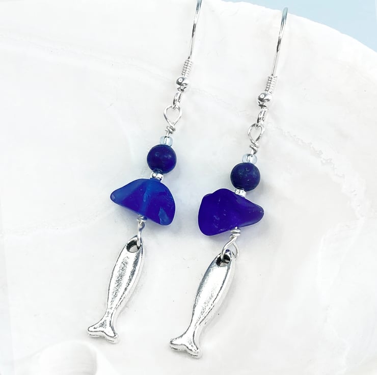 Cute sea glass drop earrings, handmade with pale blue Scottish beach glass, frosted Lapis Lazuli crystals, sterling silver beads and finished off with a sweet fish charm. The earrings include nuggets of genuine sea glass, worn smooth and frosted in the Scottish sea.