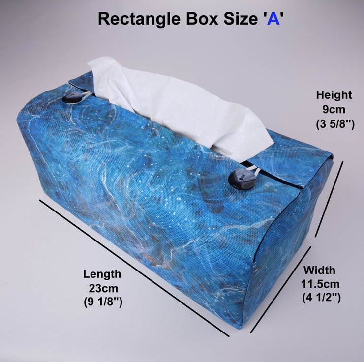 If your tissue box size is different than the measurements listed above, select the 'Custom Size' option and enter your tissue box measurements (height, width, and length) in the 'Custom Size' option box.