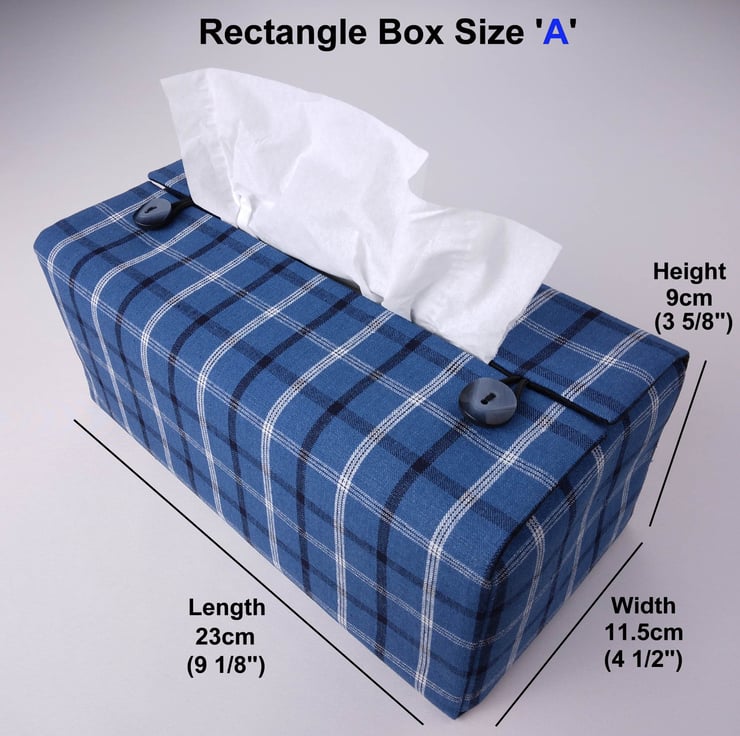 If your tissue box size is different than the measurements listed above, select the 'Custom Size' option and enter your tissue box measurements (height, width, and length) in the 'Custom Size' option box.