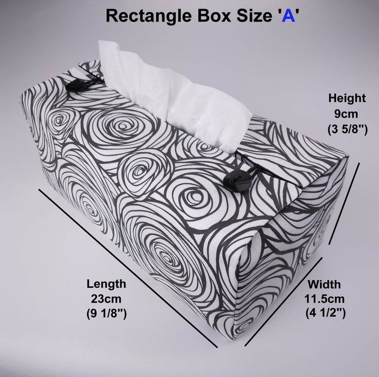 If your tissue box size is different than the measurements listed above, select the 'Custom Size' option and enter your tissue box measurements (height, width, and length) in the 'Custom Size' option box.