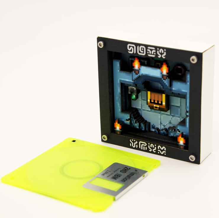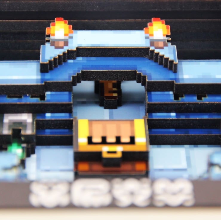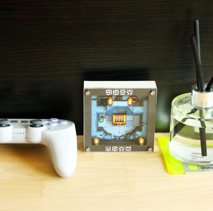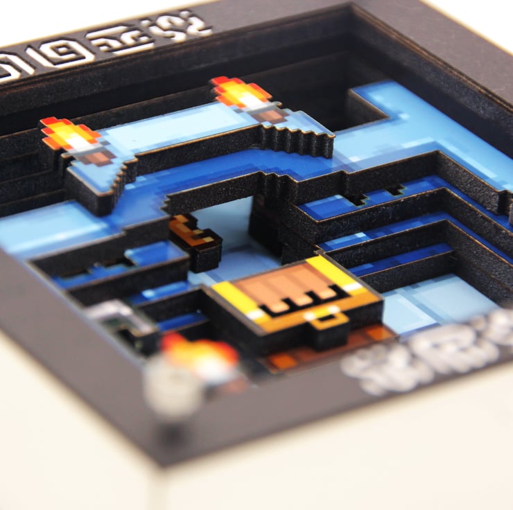 Our Zelda inspired 3D pixel art instantly takes you back to the days of trawling dungeons in A Link to the Past and Links Awakening – without actually being a Zelda game at all! Featuring remakes of iconic elements such as chest, pot, chu chu slime and hidden door key, our Miniature dungeon is designed at a super low res of 80x80 pixels with only 64x64 visible. This is one of our miniature series and makes the perfect gift or provides a little taste of what our bigger creations offer.