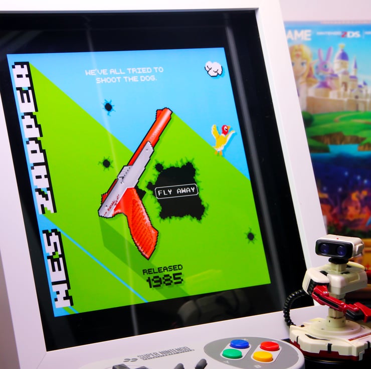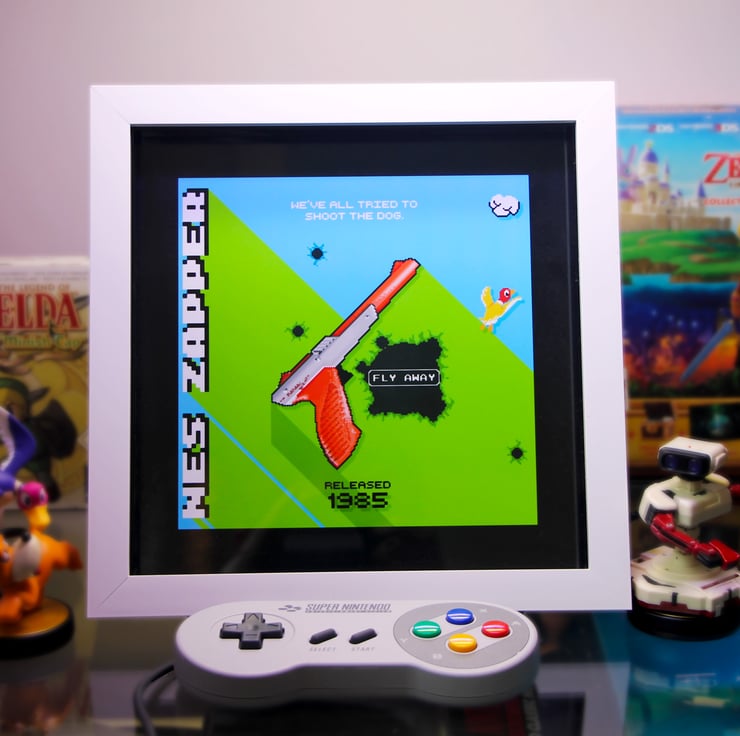 Relive the classic days with our Duck Hunt / NES Zapper Nostalgia artwork. Hand drawn 1 pixel at a time to deliver a unique piece that makes the perfect gift for any retro fan of the 8 bit era.