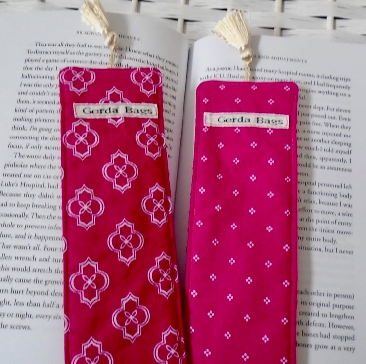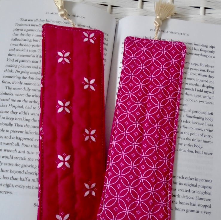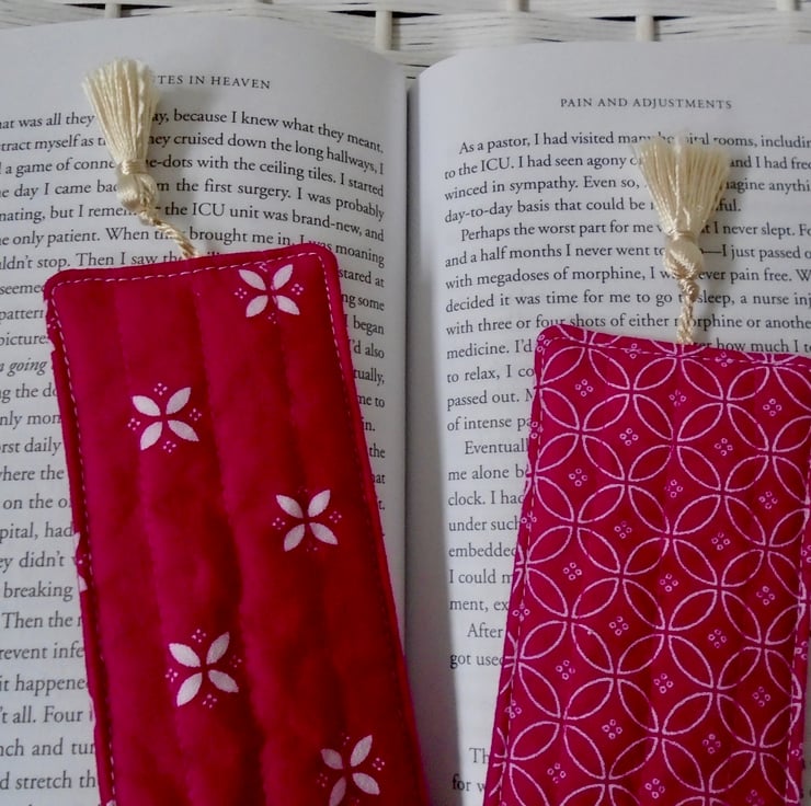Made in pretty cotton fabrics , lightly padded , and machine quilted . PRICE IS FOR 2 BOOKMARKS