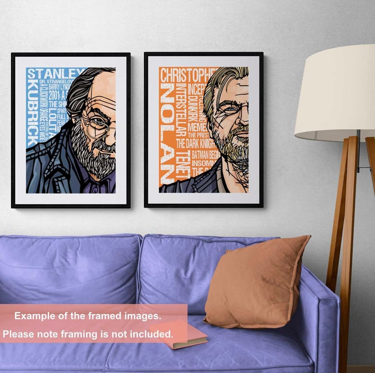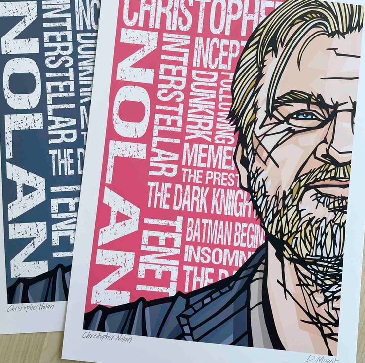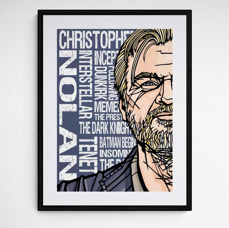 A vibrant art print featuring acclaimed film-maker Christopher Nolan. The background design features titles from his filmography.