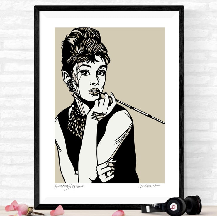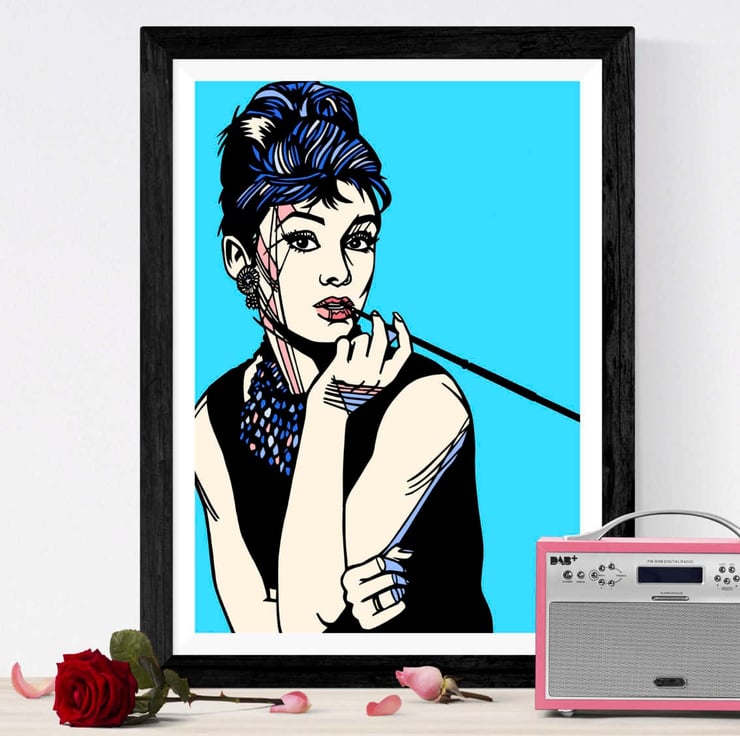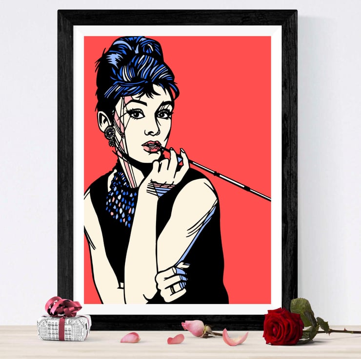 A vibrant art print featuring the iconic Audrey Hepburn from the classic film Breakfast at Tiffany's. A choice of four backgrounds are available - Red, Blue, Yellow and Sepia tones.