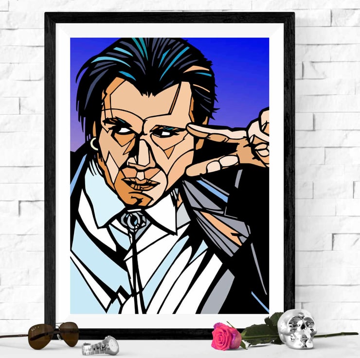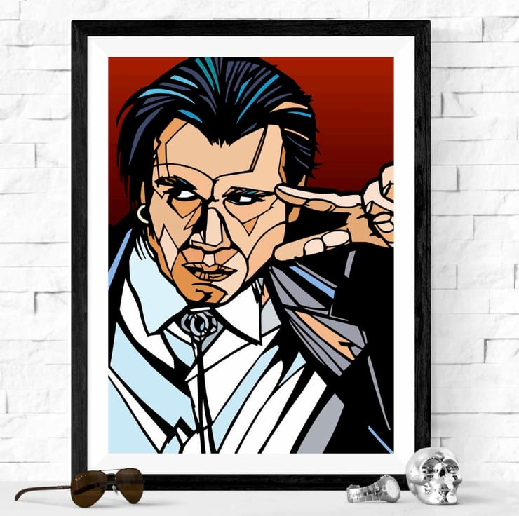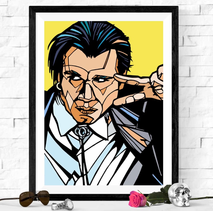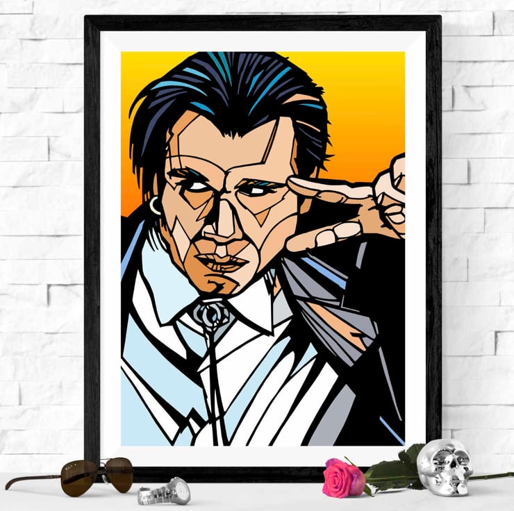 A vibrant Pop Art art print featuring John Travolta as Vincent Vega from Tarantino's 1994 film Pulp Fiction. A variety of colour schemes are available to suit your personal taste. The design is taken from my original papercut.