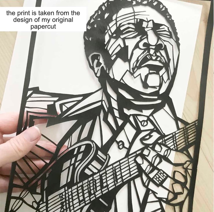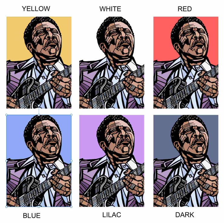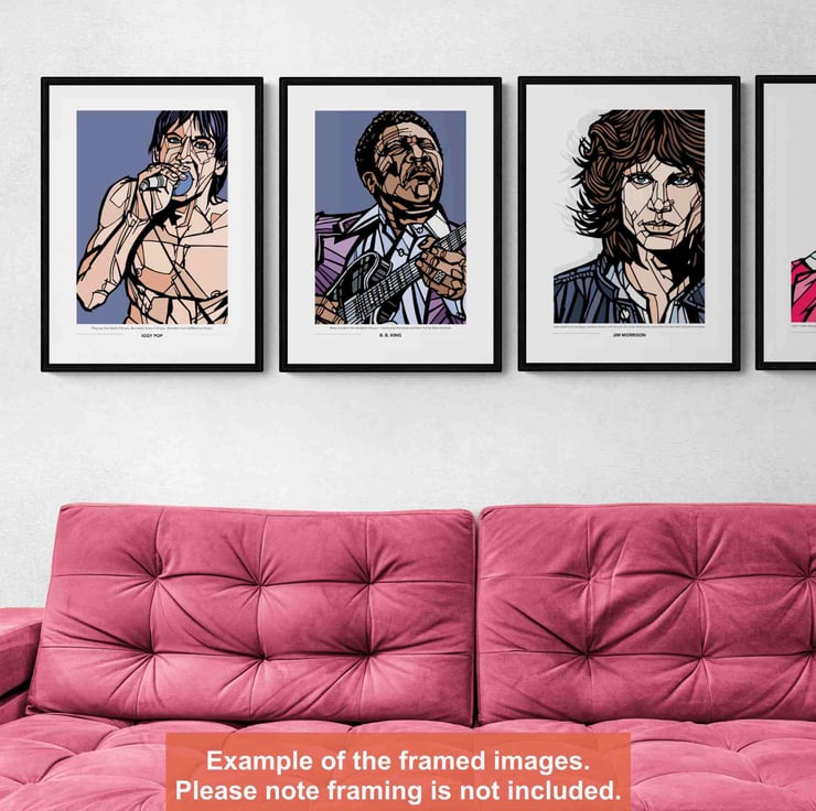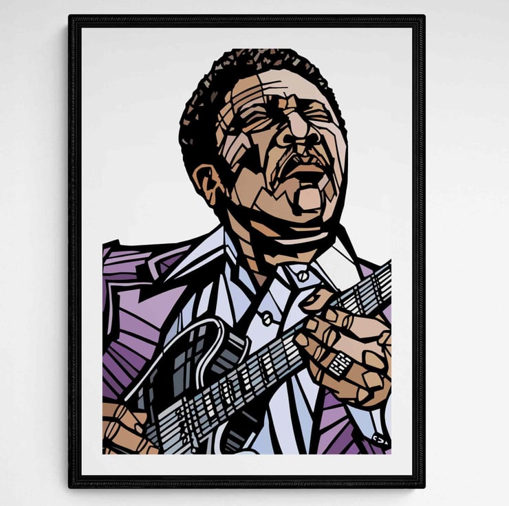 A vibrant art print featuring the man known as 'The King of the Blues', singer-songwriter, BB King.