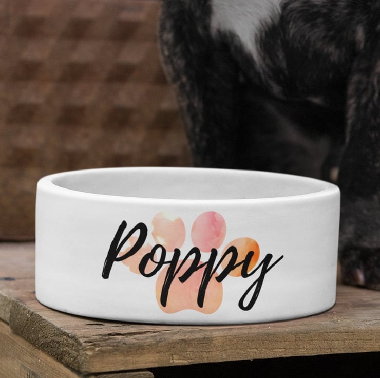 Please browse through the images to see the design mock ups. Once you decide to order a custom pet bowl select the size and paw design using the drop down menu. Add the custom name on the pet bowl in the text box.