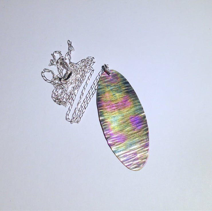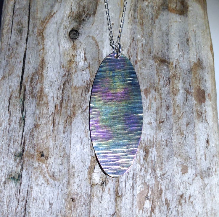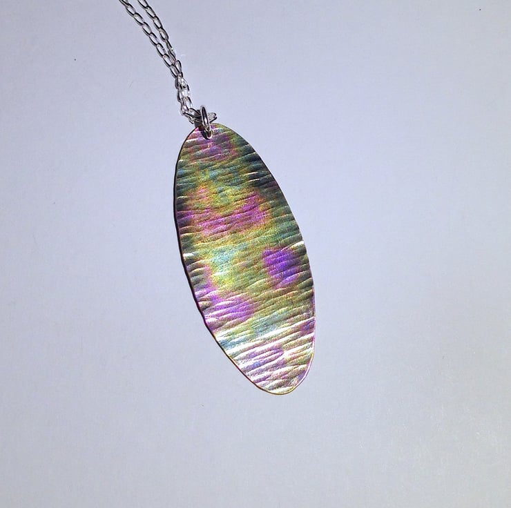 This titanium pendant necklace displays a range of attractive shades which really come to life when they catch the light.