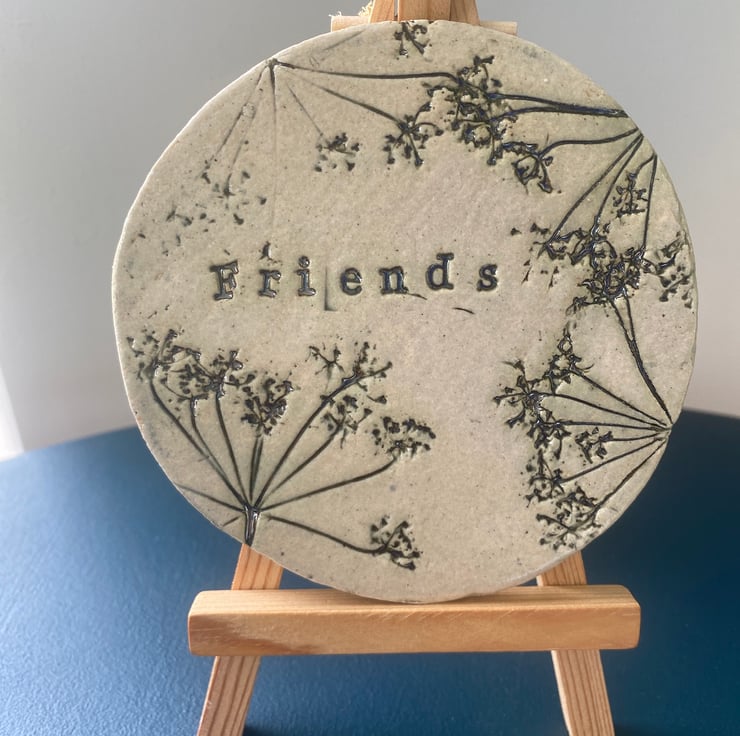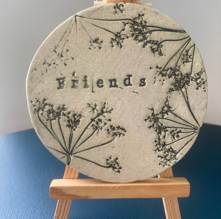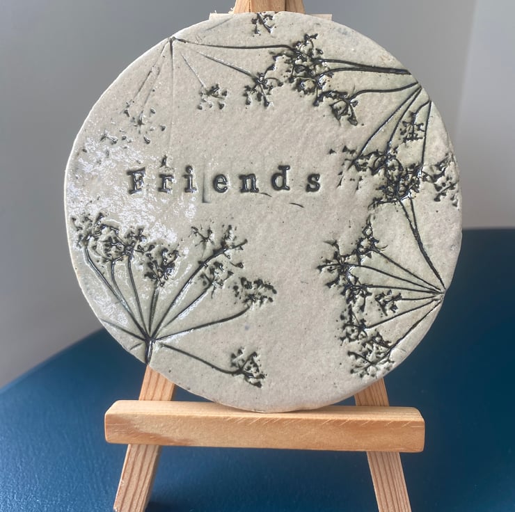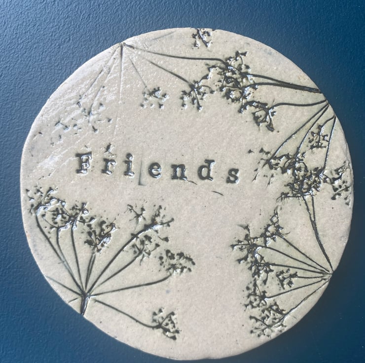 Each coaster is made from clay which is hand pulled by ourselves to prepare it for use. It is then rolled and stamped by us, using foliage from our local Lincolnshire countryside. At this time of year we take advantage of the abundance of cow parsley. we then fire the coasters at a lower heat before glazing and firing a second time at 1200 deg. The process is slow to ensure the clay is not fired too quickly and to ensure the clay remains flat.