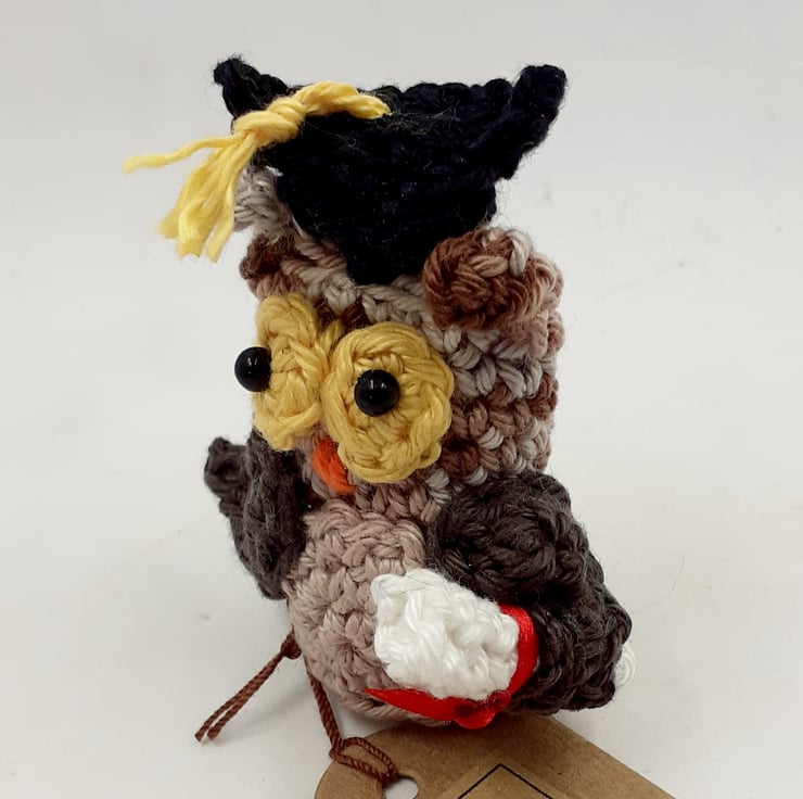 This wise little chap is all ready to deliver exam congratulations on your behalf. He is crocheted in cotton and filled with polyester stuffing. There is a 2p piece in the base to help him stand. He has beady black eyes and carries a tag which reads 'Congratulations You Did It!' although I am very happy to exchange this tag for one with wording of your choice. He measures approximately 8 cm tall and comes wrapped in tissue in a labelled PIP ( Postage in Proportion) box, all ready to be given or posted on.