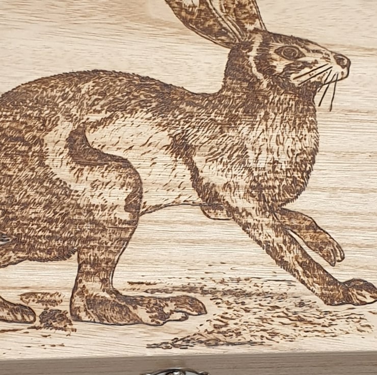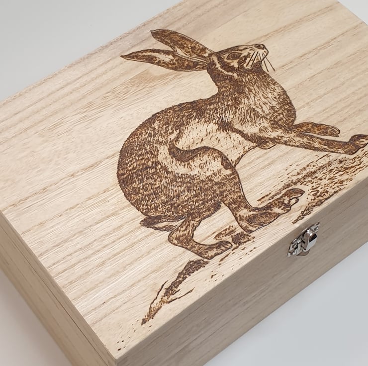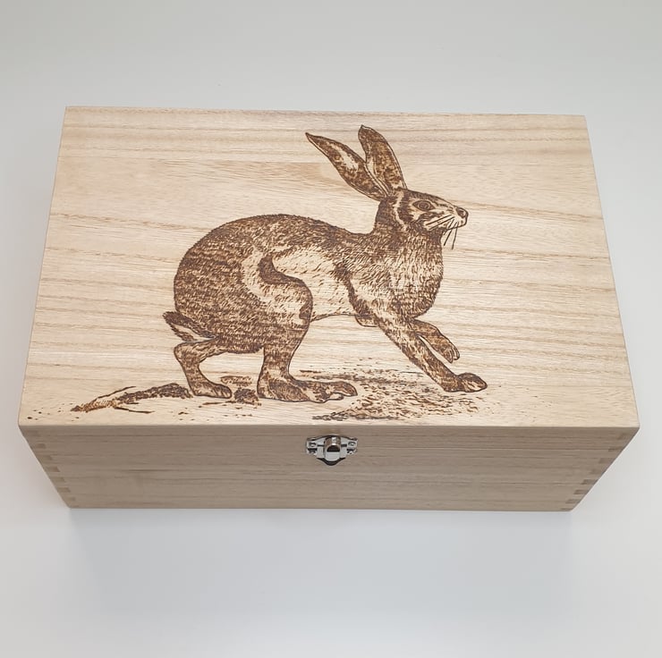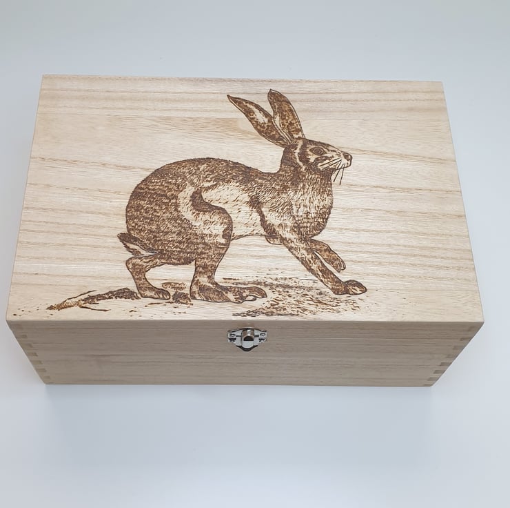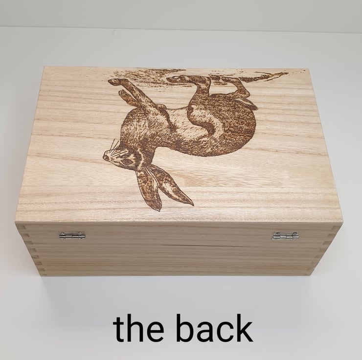 Large wooden storage box which has been lovingly handburnt, using pyrography, with a gorgeous hare on the lid perfect for use as a photo box, memory or keepsake box. The outside of the box has then been given several coats of satin varnish for protection. The box has a secure metal clasp.